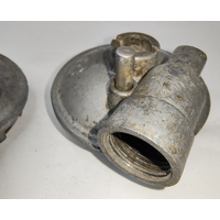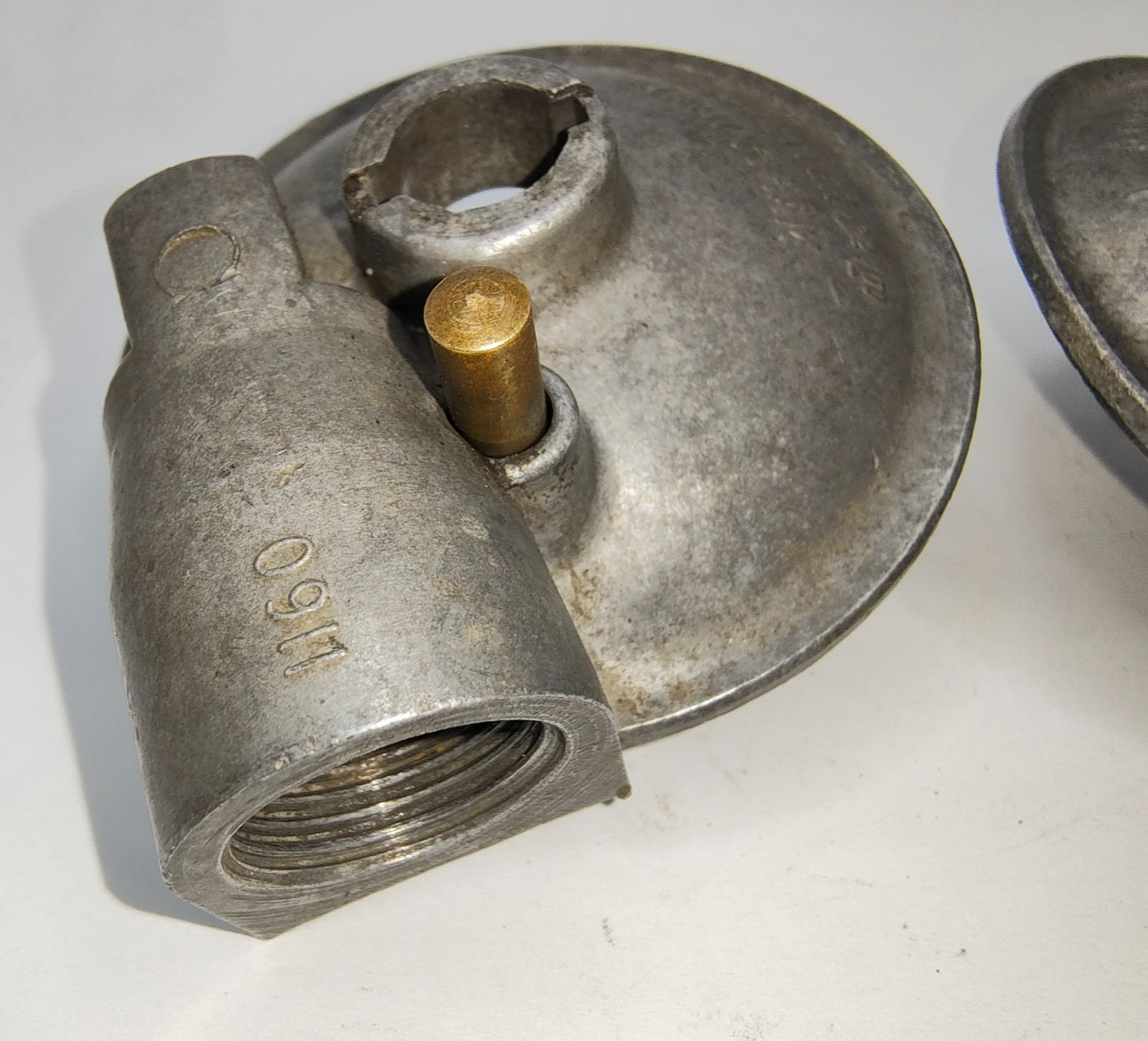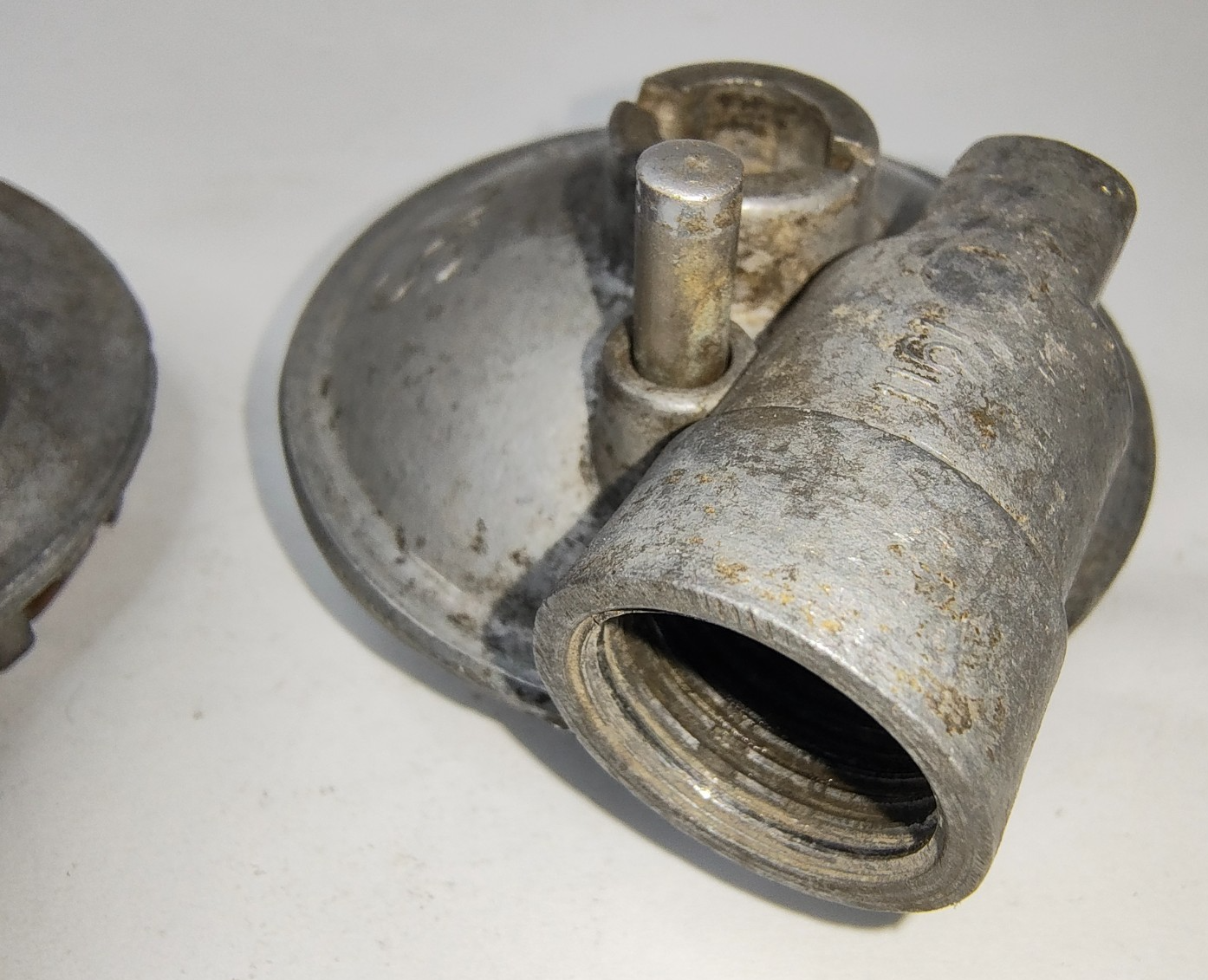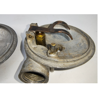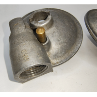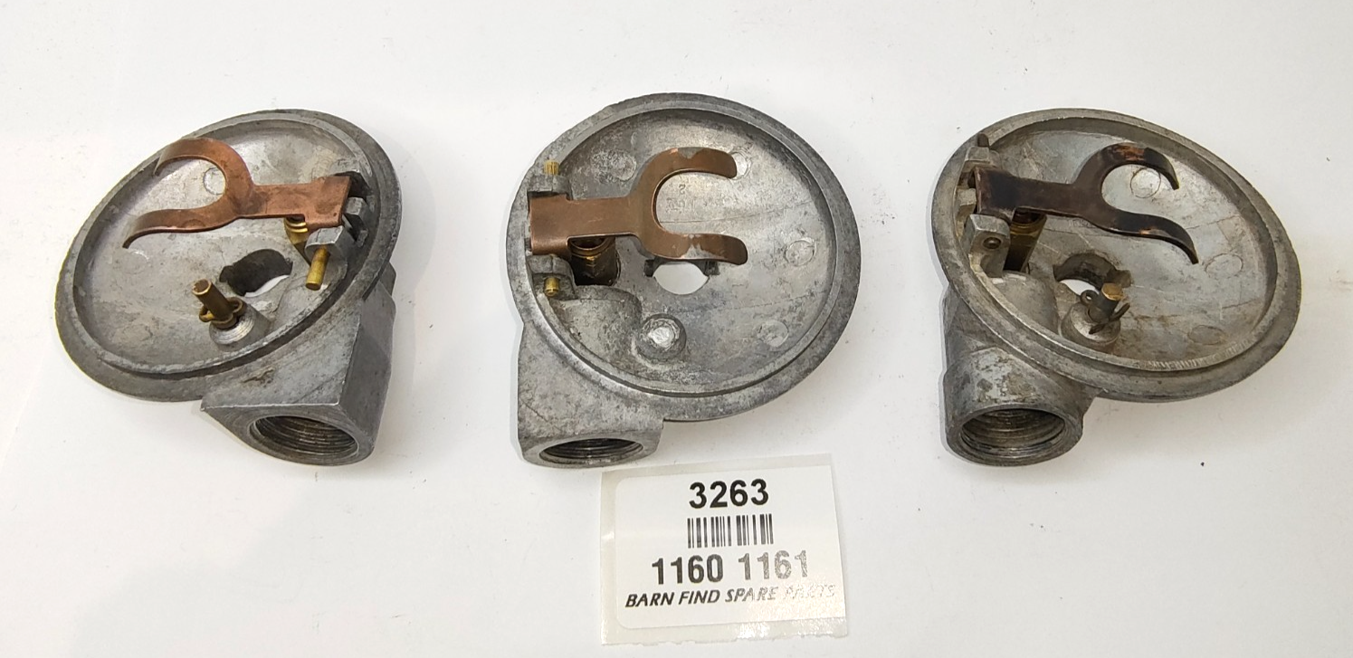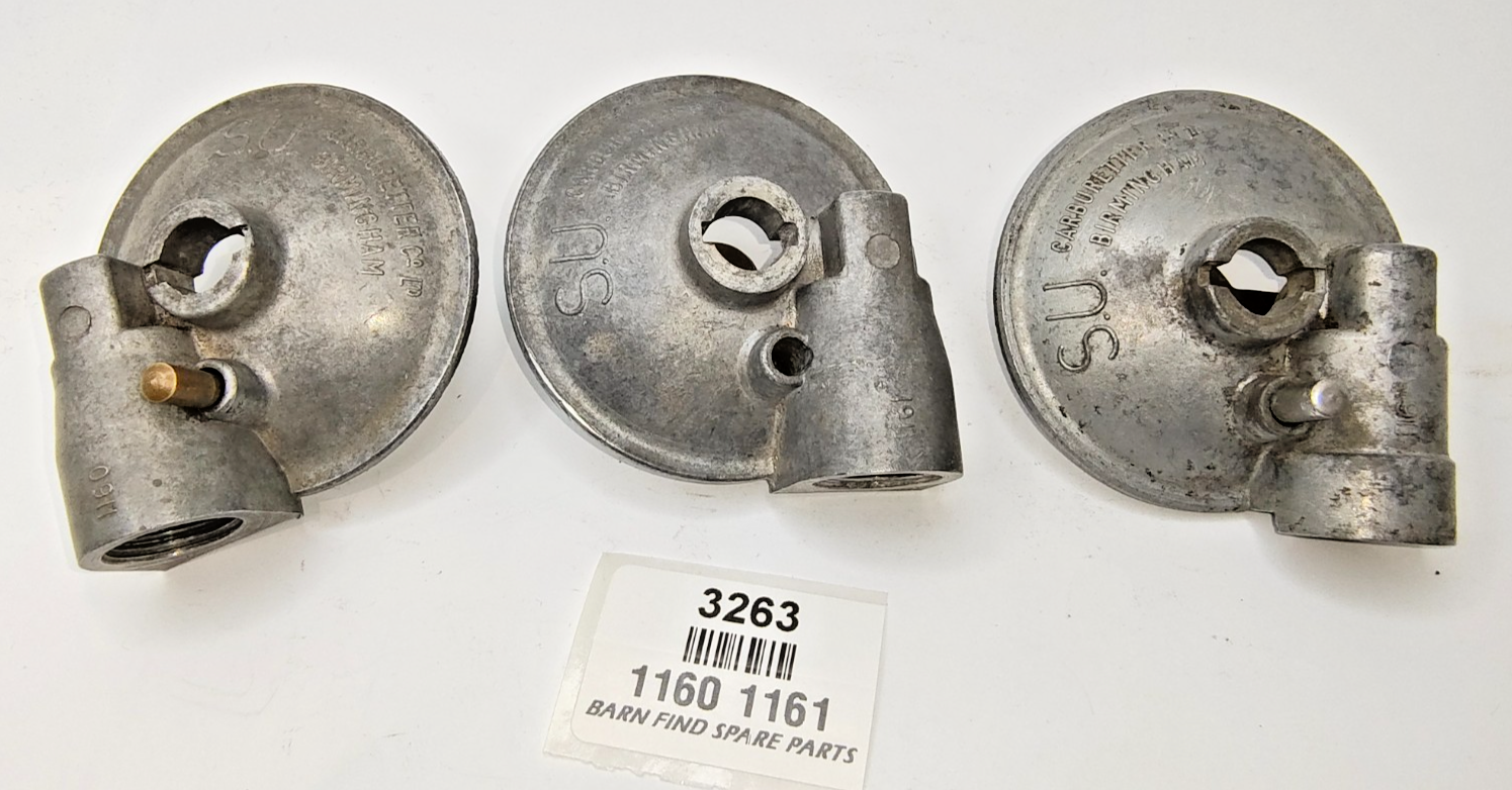 SU T2 Fuel Bowl Lid set of 3 lids, each measure 2 3/8 inches in diameter there are two right hand entry (1161) and one left hand entry (1160). All three come with needle and seats, float fork and two come with ticklers. The threads on the entry are all in good order. To Suit a number of Jaguar carburetor H8 sets but these three are from a Jaguar E Type.