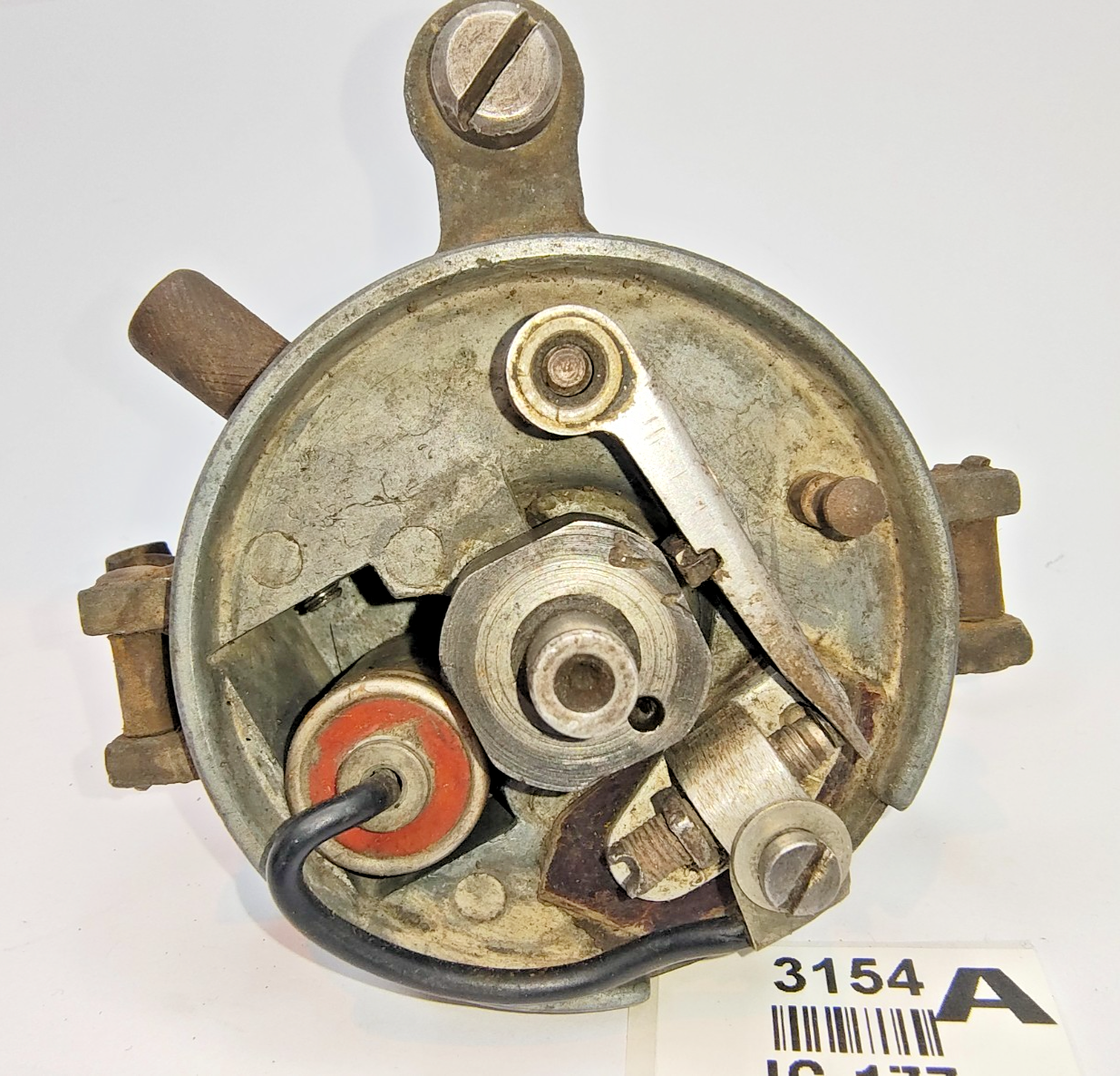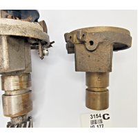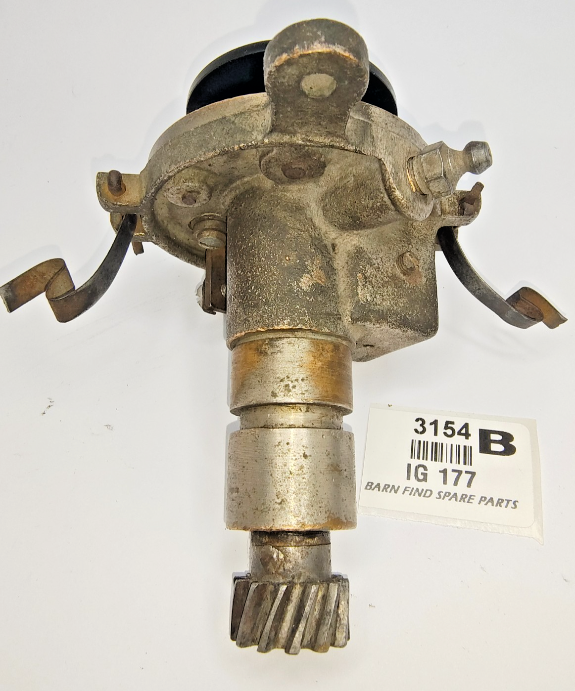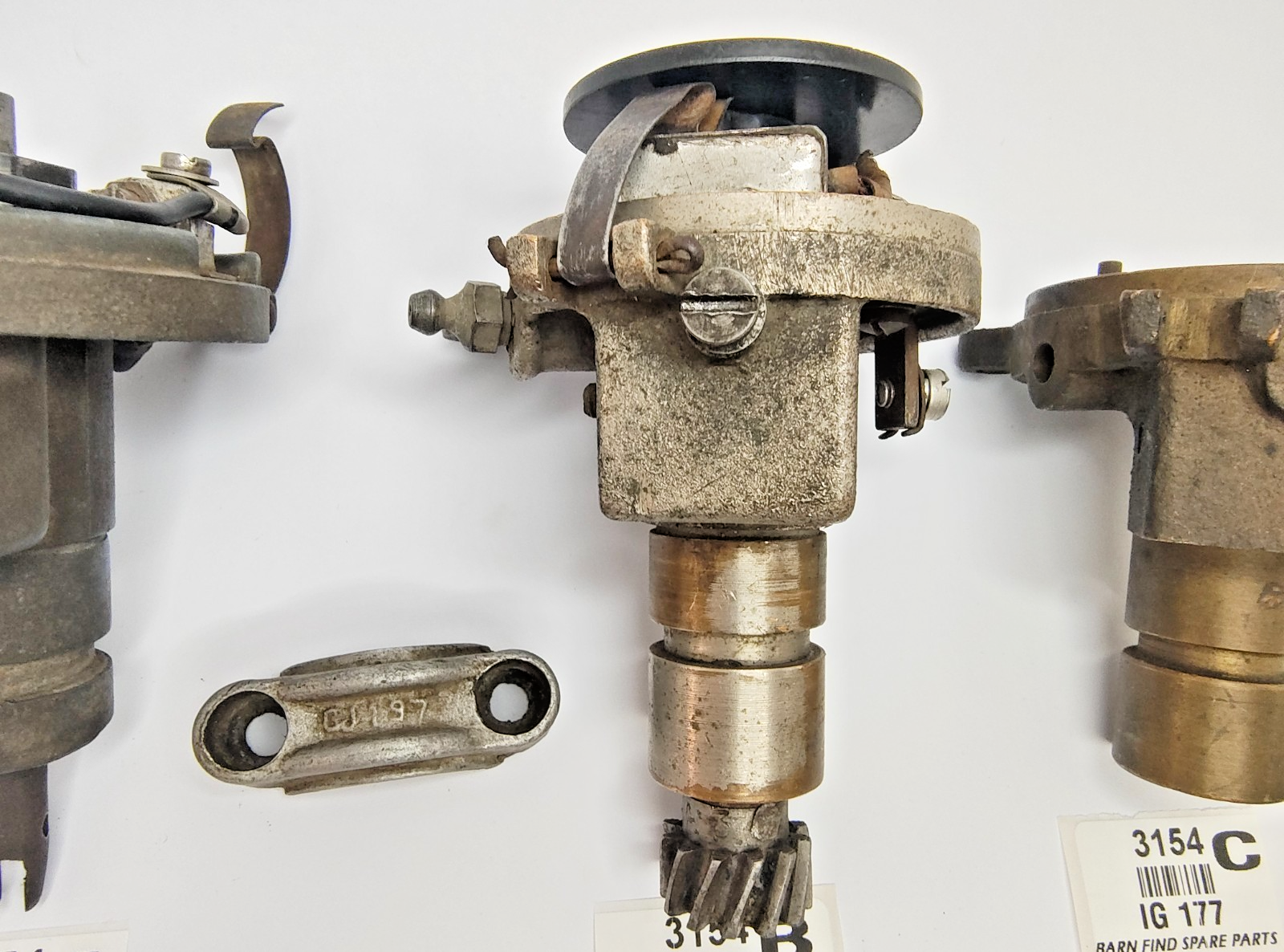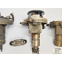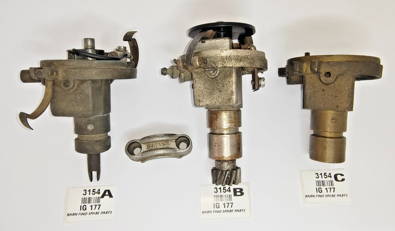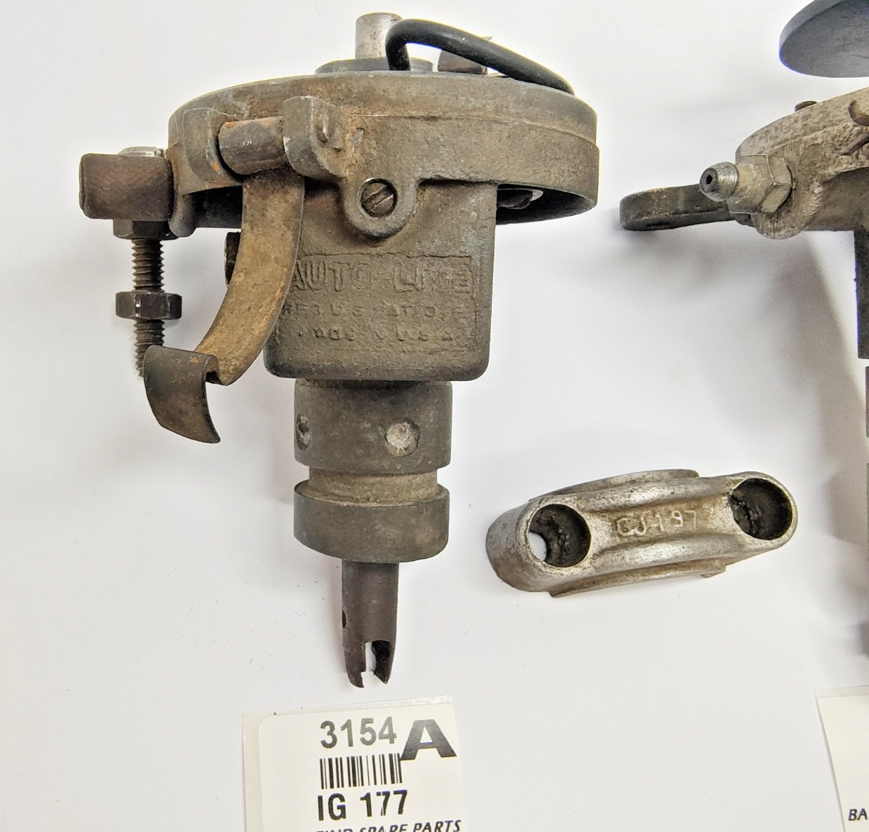 Autolite Auto-lite Distributors Job Lot - all three distributors and one mounting collar are included.  IG- 177 maybe to suit an Overland 4 cylinder model 91 and 92 models from around 1923 - 1925 or possibly fitted to a Willys. One of the distributors marked "A" is the original which is made of diecast but as was the case many were/ have been recast in brass, The distributor marked "B" with the gear drive is one of those and the one marked "C " is a brass casting which could be configured to suit a specific fitment method as some of the Autolite IG 177 were fitted to and driven from the back of the generator. "B " appears to have the original condenser with a replacement condenser fitted to "A" which has also had a bleed nipple fitted as a replacement breather. There is a mounting collar marked GJ -197  that will fit around either of the 3 shafts as shown. Distributor "A" may possibly have been fitted to the rear of the generator, but that is just an assumption and at best a guess. Please see photo(s) - they form part of the description.