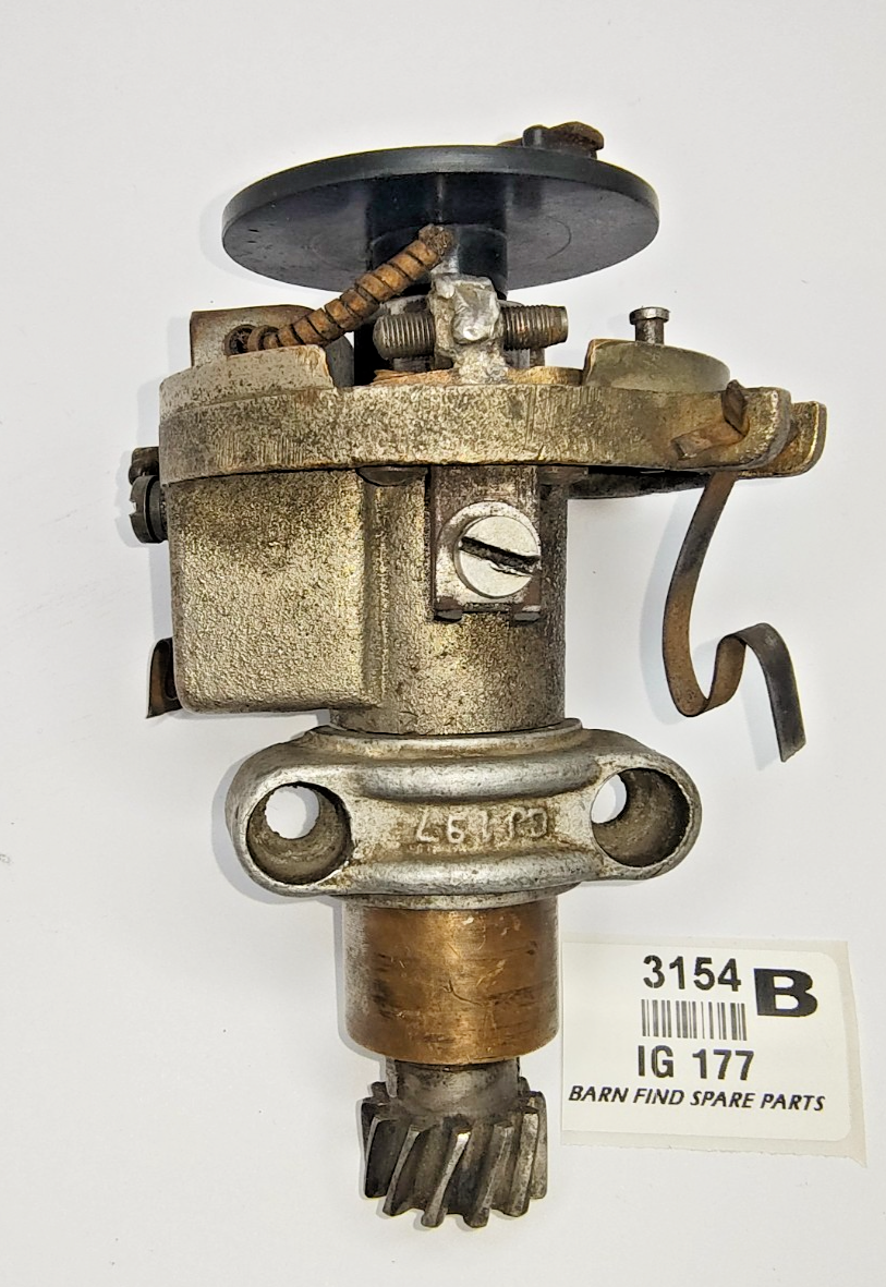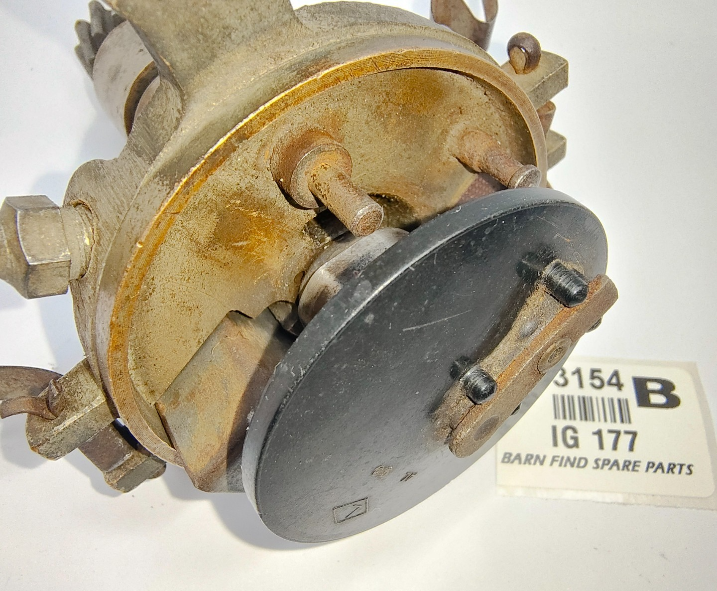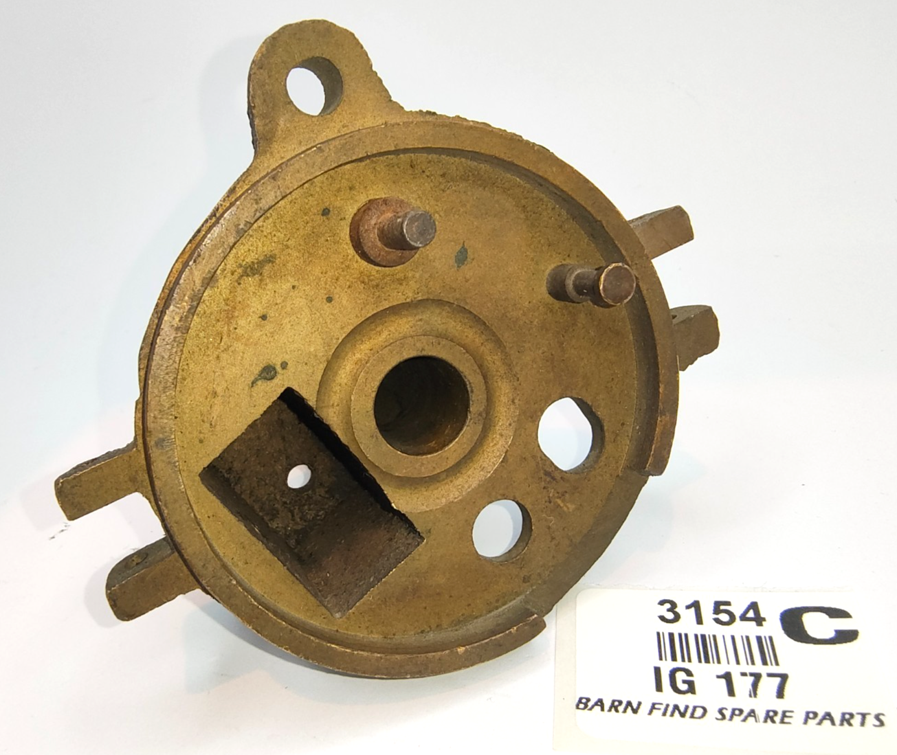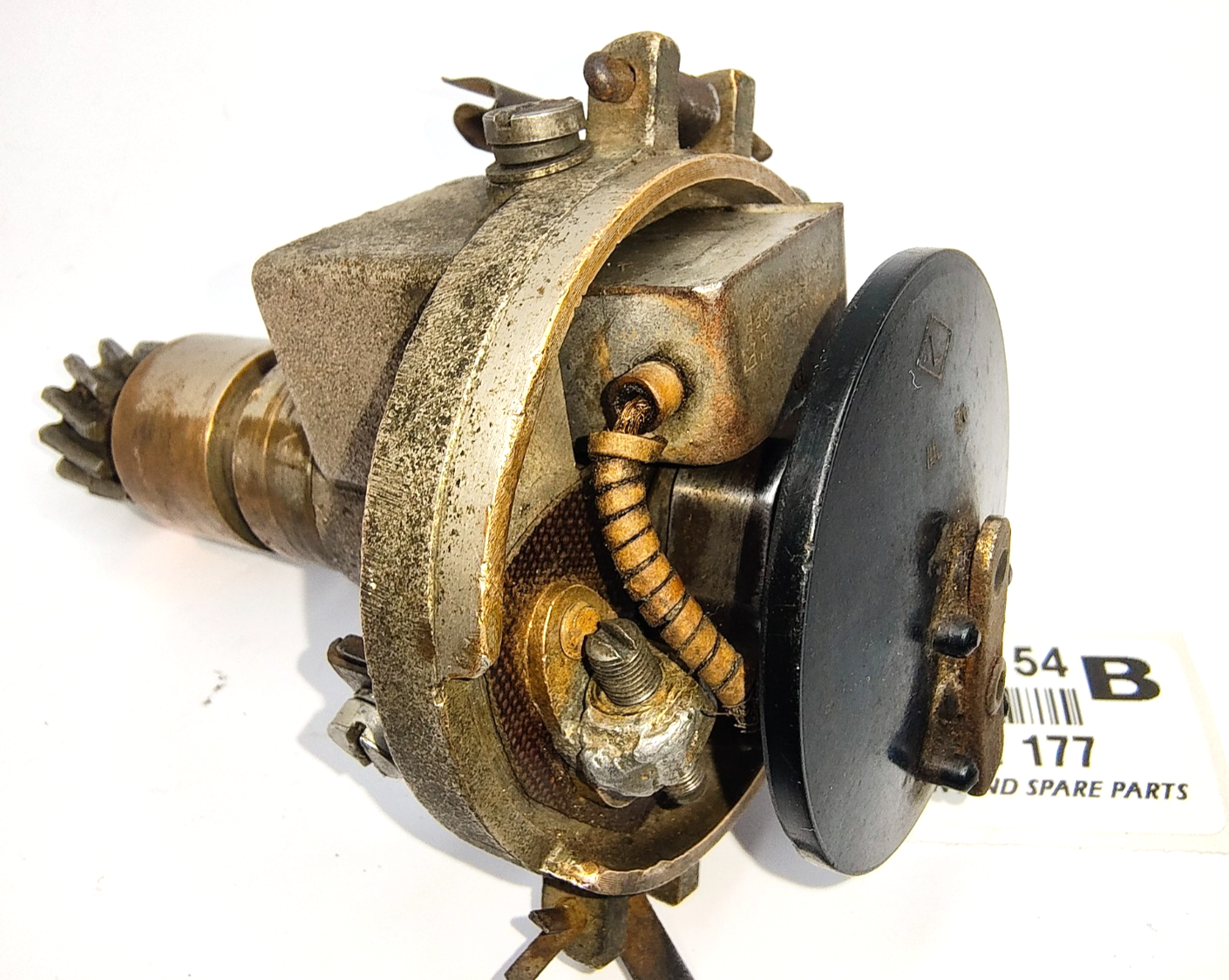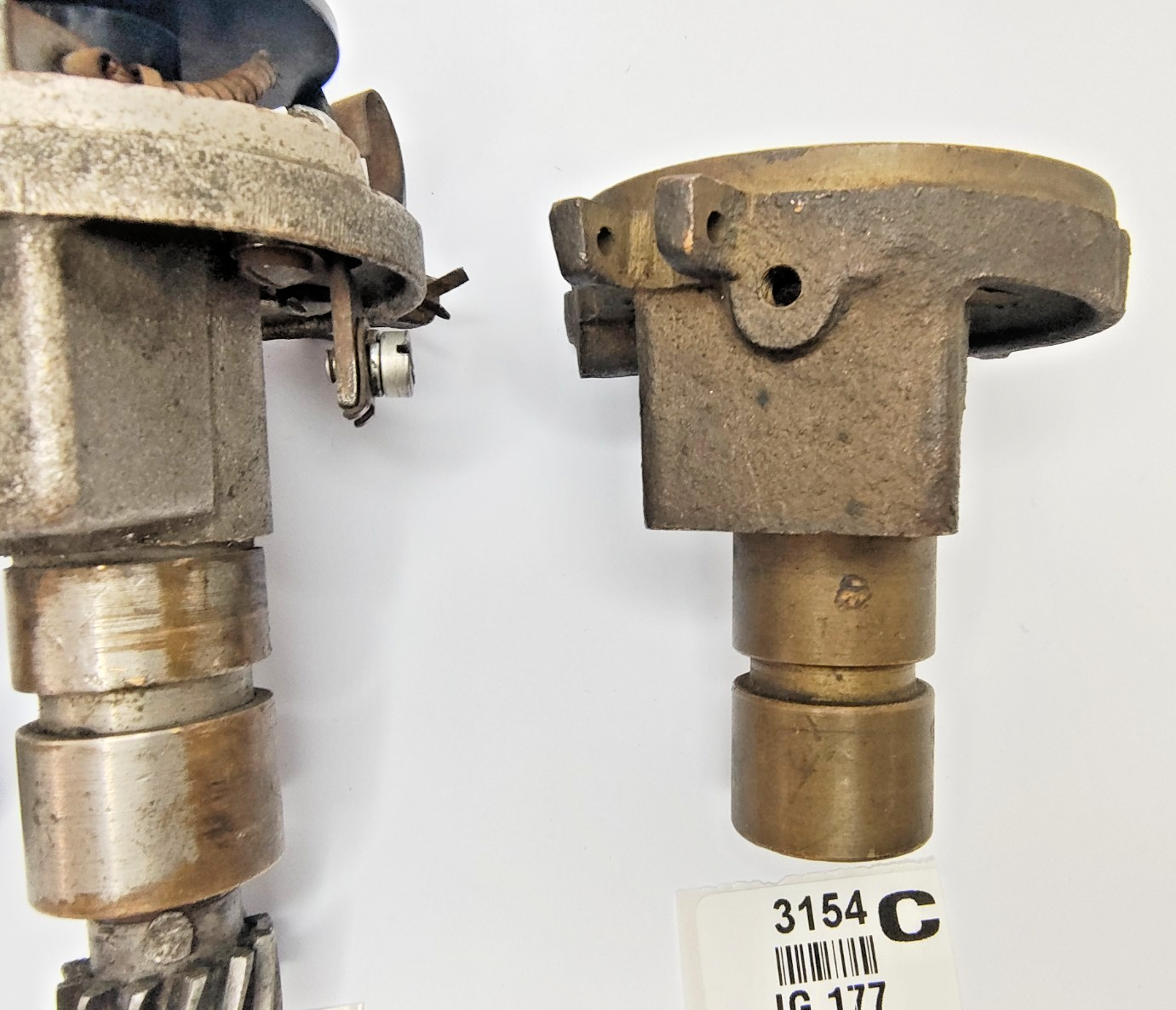 Autolite Auto-lite Distributors Job Lot - all three distributors and one mounting collar are included.  IG- 177 maybe to suit an Overland 4 cylinder model 91 and 92 models from around 1923 - 1925 or possibly fitted to a Willys. One of the distributors marked "A" is the original which is made of diecast but as was the case many were/ have been recast in brass, The distributor marked "B" with the gear drive is one of those and the one marked "C " is a brass casting which could be configured to suit a specific fitment method as some of the Autolite IG 177 were fitted to and driven from the back of the generator. "B " appears to have the original condenser with a replacement condenser fitted to "A" which has also had a bleed nipple fitted as a replacement breather. There is a mounting collar marked GJ -197  that will fit around either of the 3 shafts as shown. Distributor "A" may possibly have been fitted to the rear of the generator, but that is just an assumption and at best a guess. Please see photo(s) - they form part of the description.