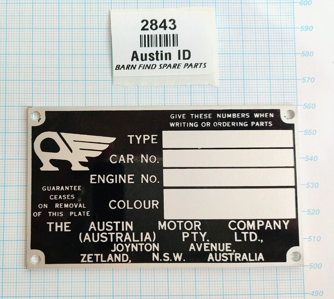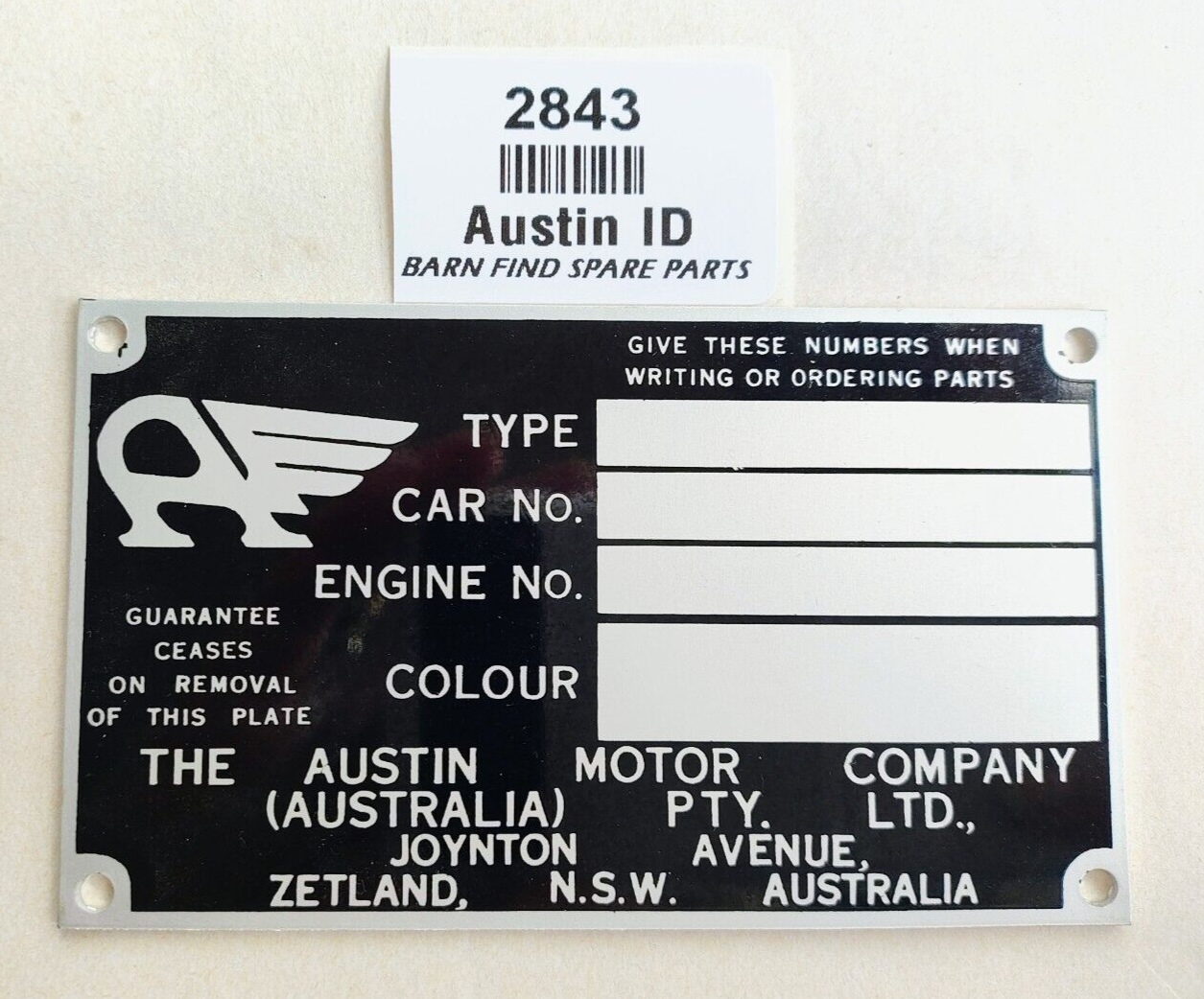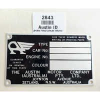 Chassis ID plate Flying A Austin Australia Silver & Black. Aluminium chassis vehicle identification ID Plate New Old Stock.  Suits Australian Sprite.  Please see photo(s) - they form part of the description.