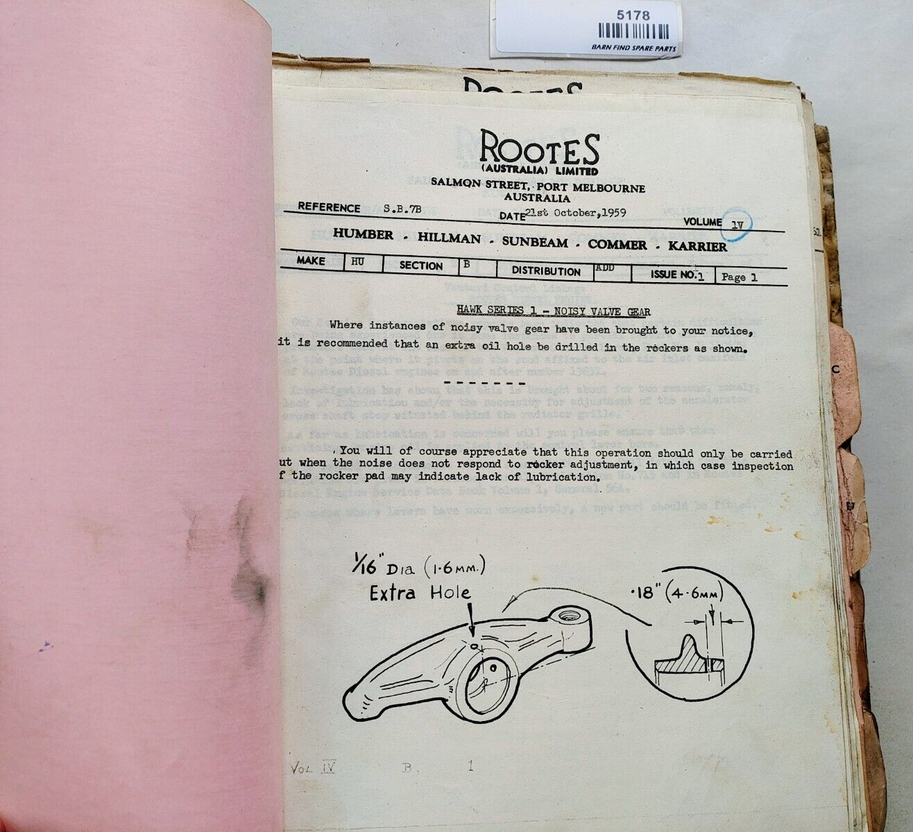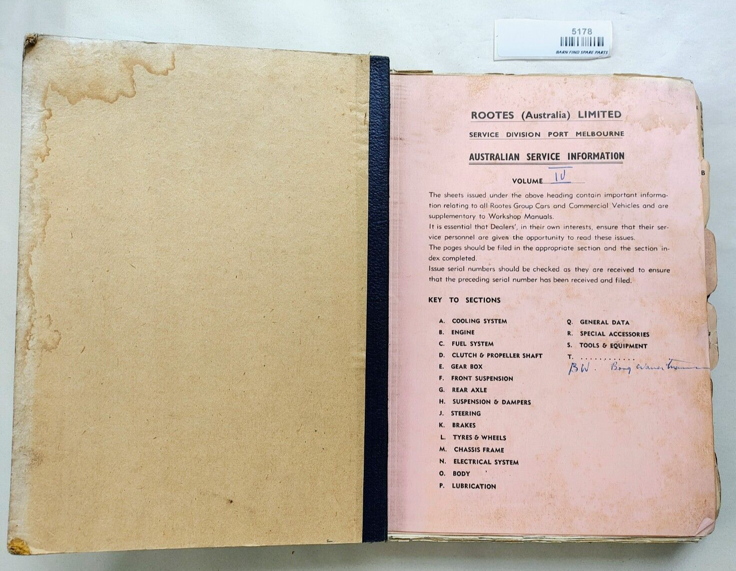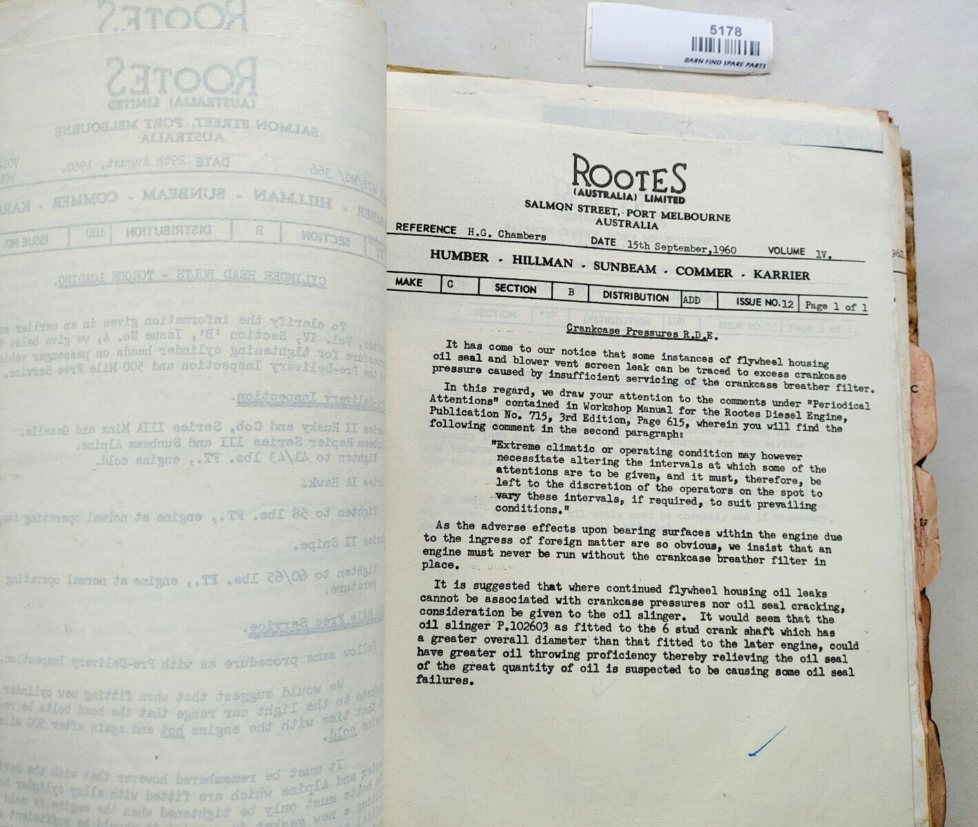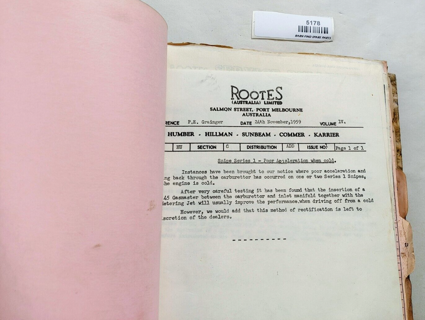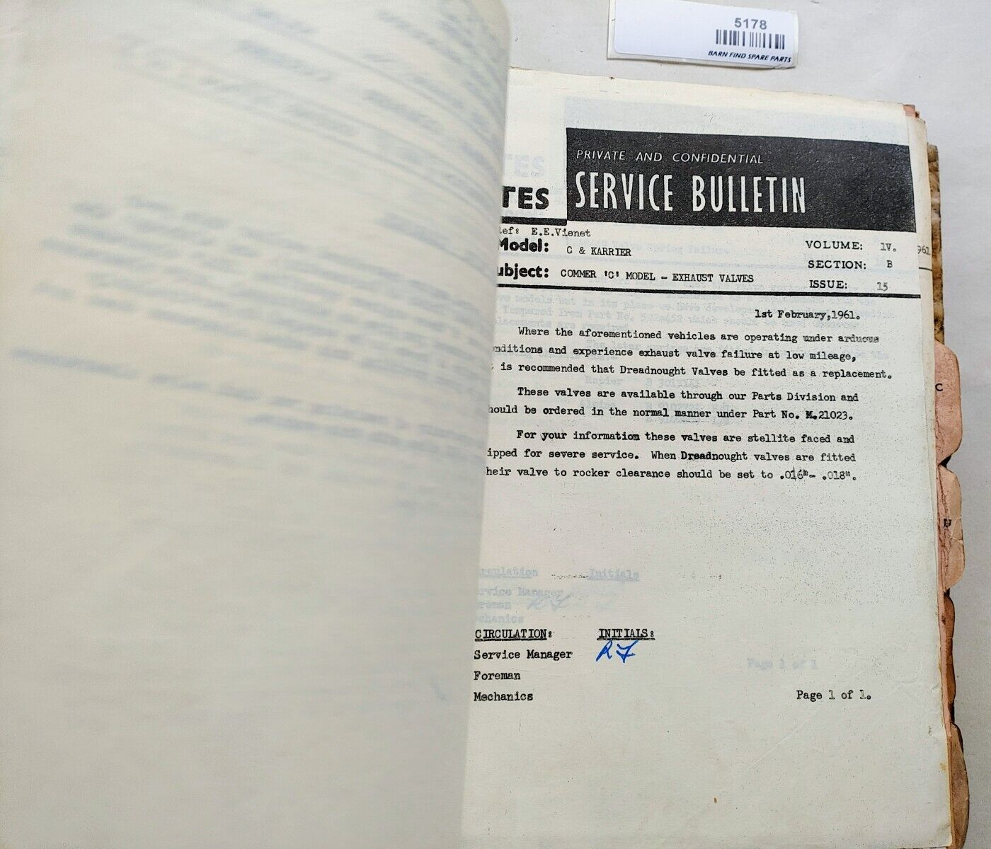 Cars - Humber Hillman Sunbeam Commercial Vehicles - Commer Karrier. Loose leaf screw post bound with hard cover. Service bulletins mostly from 1959 1960 1961, ther must be a hundred or more bulletins.