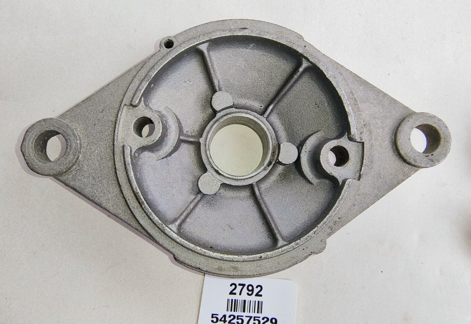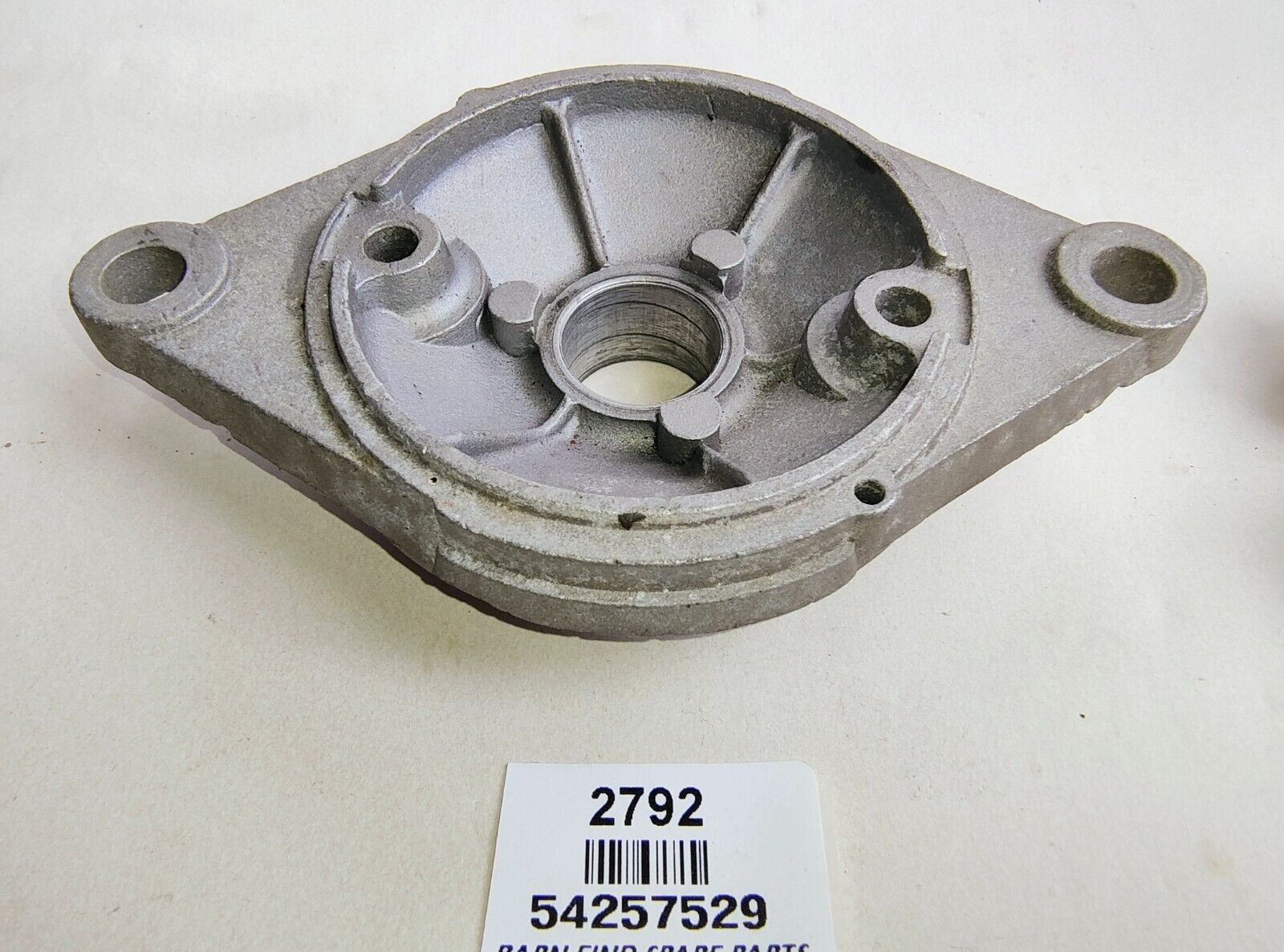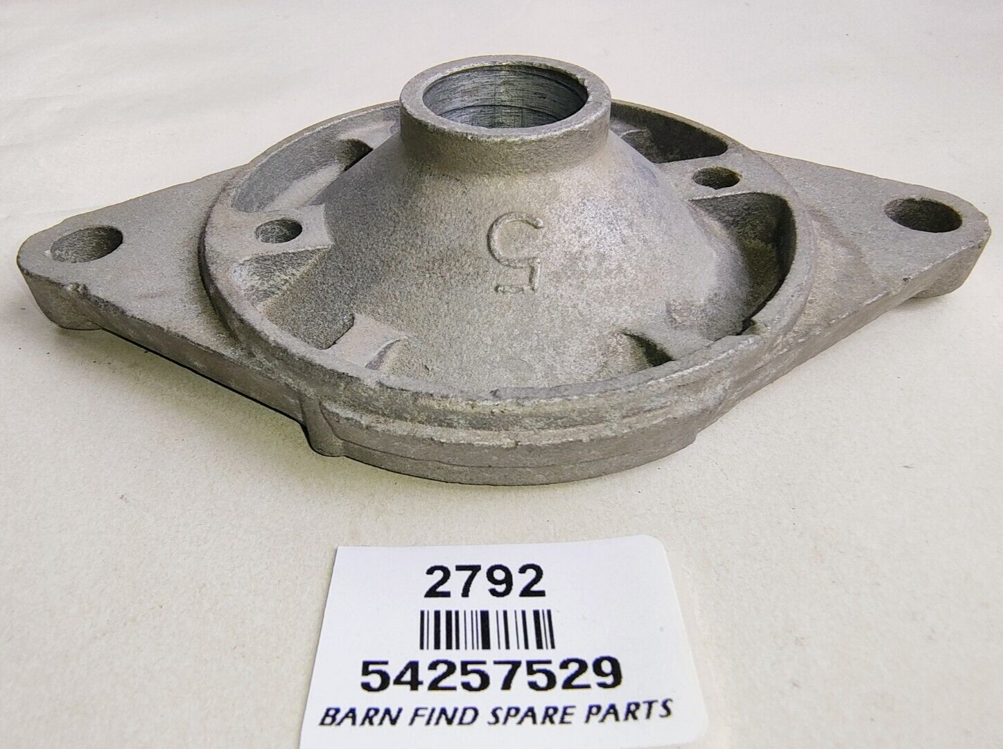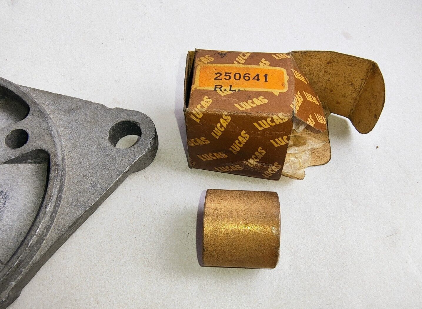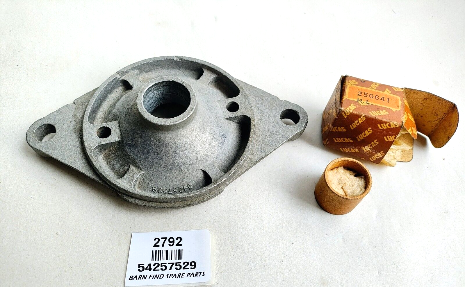 Lucas Starter Motor   Drive End Bracket, 54257529 FR8. New Old Stock.  This drive end bracket has a M3.25 inch diameter yoke the bracket also shows some  "shop grot " the mounting hole centres are 5 inches apart. This bracket comes with a new Lucas in box bush ( 250641 ) to suit. PLEASE see photos as they form part of the description.