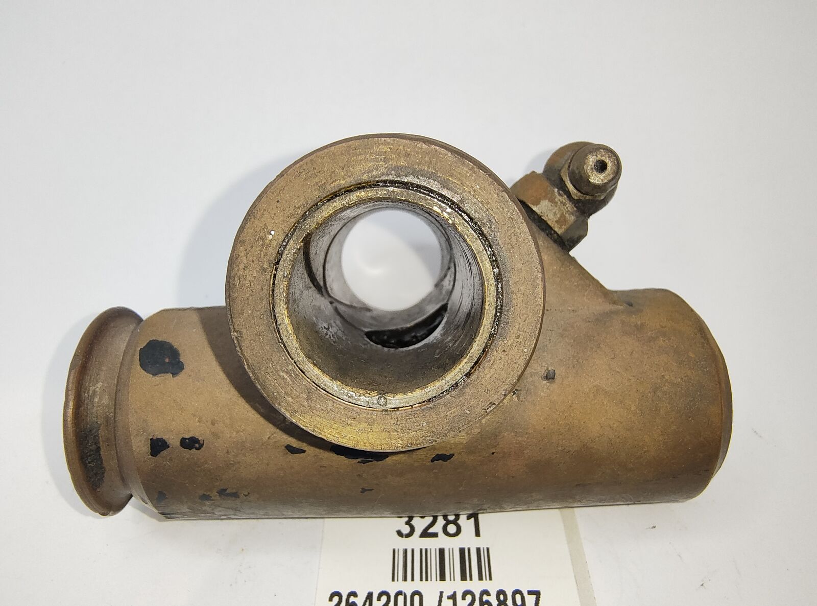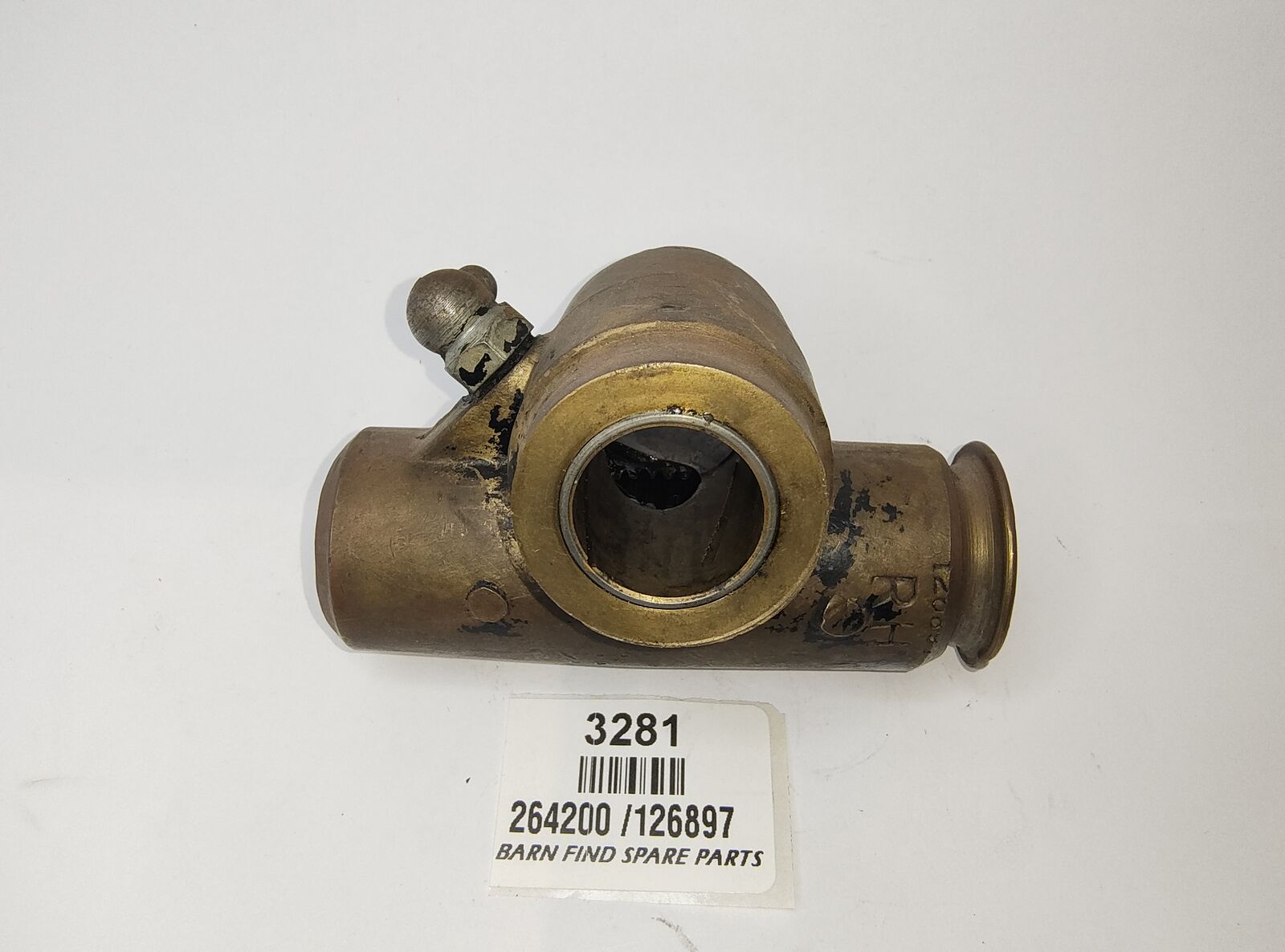 MG Original Brass FRONT SUSPENION BOTTOM SWIVEL LINK right Hand Bottom. Good Used Condition, brass construction with R H stamped into the housing and the number 126897 just make out last digit , includes grease nipple, threads are in good condition as is the bronze bush also in good condition (we tested bush by temporarily fitting the metal spacer to suit which moved freely and did not have any slop/play)amount of movement) To Suit MG TD, TF, MGA.