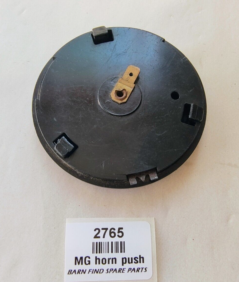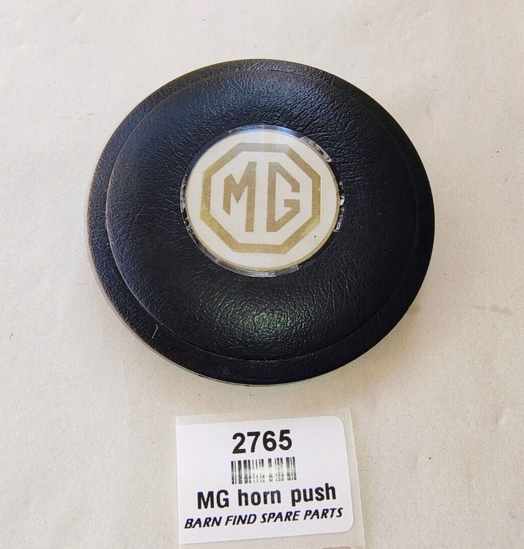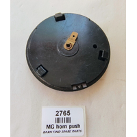 MG wheel centre horn push - black plastic. The emblem is plastic with white background gold lettering 35mm diameter. Entire centre measures 83mm diameter. Please see photo(s) - they form part of the description.