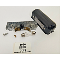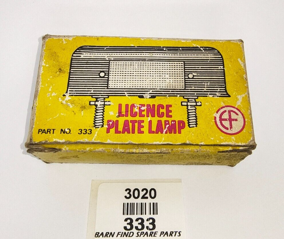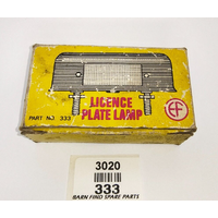 New old stock in box vintage License Plate Lamp, black metal/tin Part No. 333 Black painted metal/tin top and clear plastic lens. Includes globe. Made in Hong Kong. Please see photo(s) - they form part of the description.