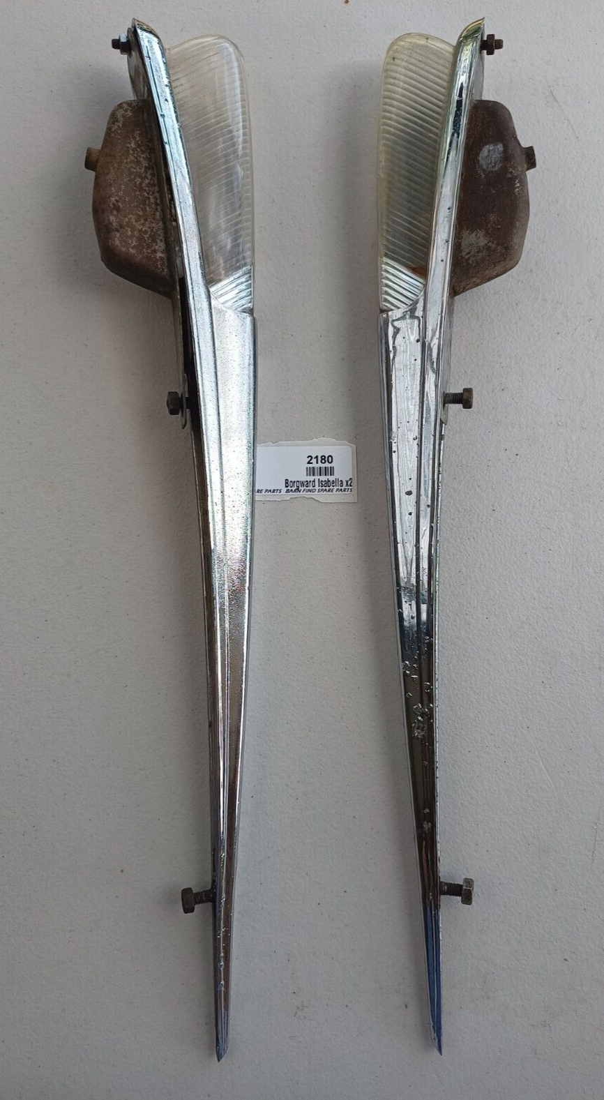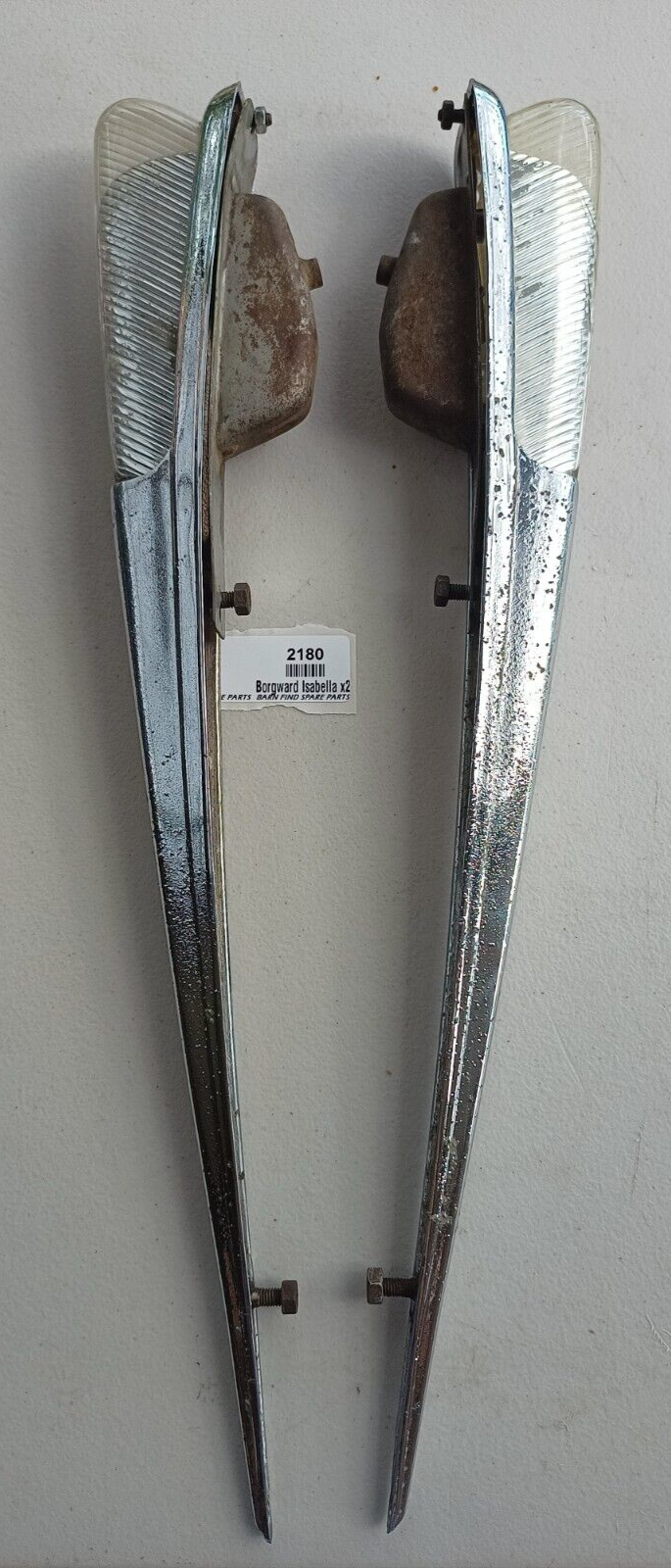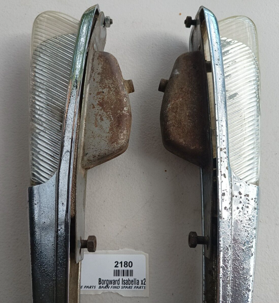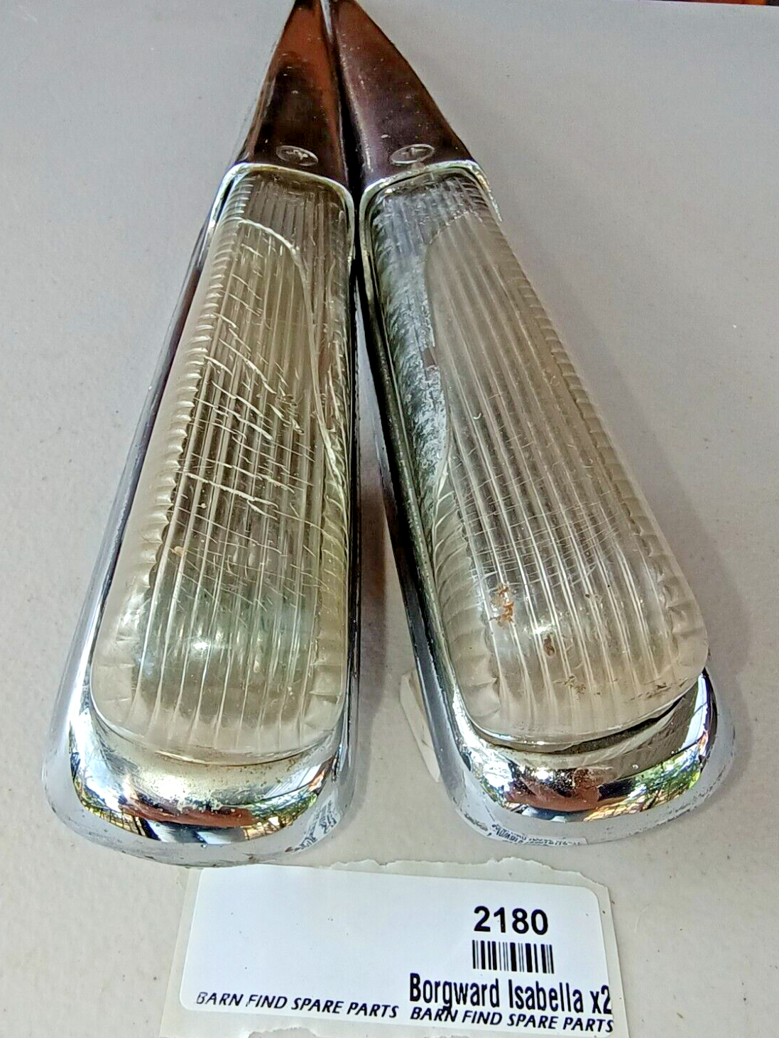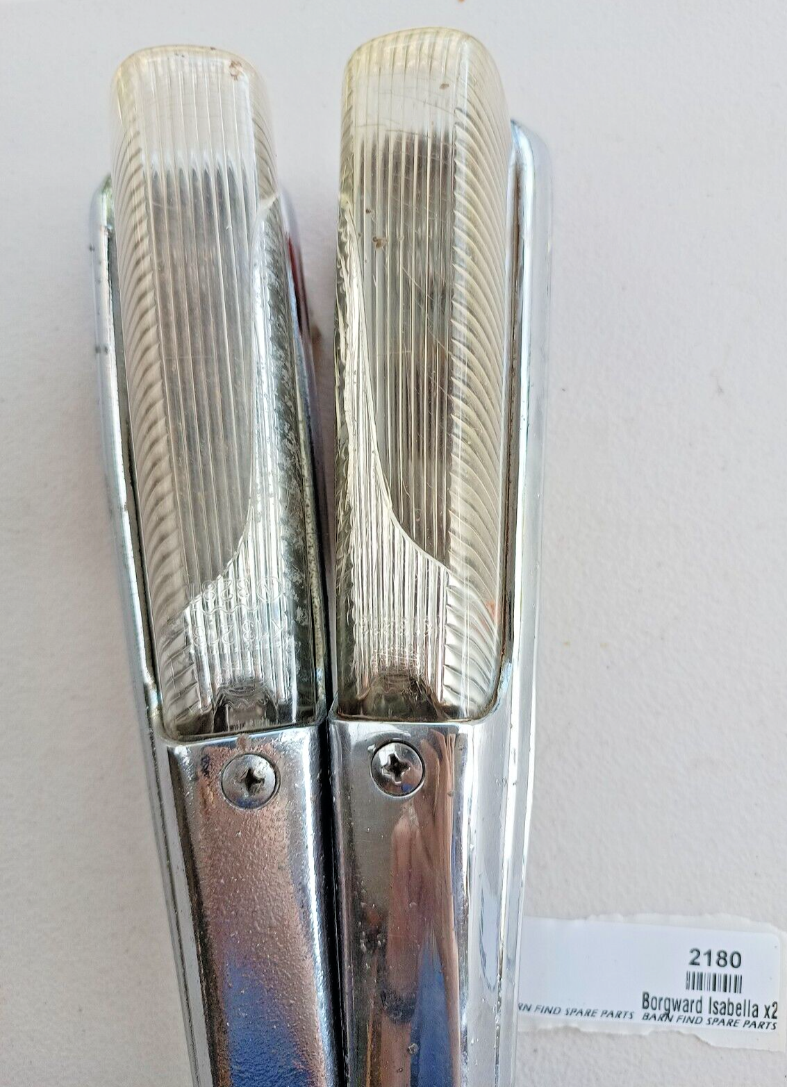 Original Borgward Isabella USED pair of left and right front Indicator housings with lenses as fitted to the top of front guards on both the coupe and saloon. They both show some pitting to the chrome. They came from a mid 60's Borgward dealer and service centre.  Used condition, bulbs tested and working - please see photos as they form part of the description.