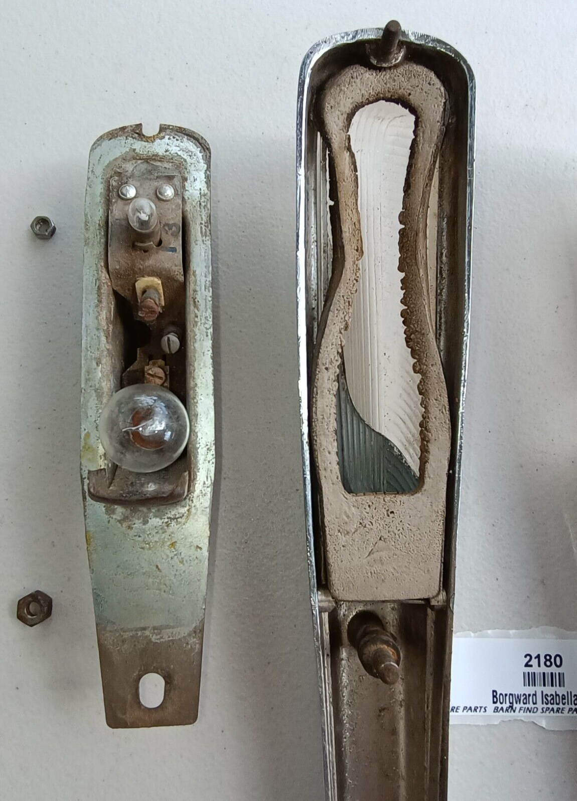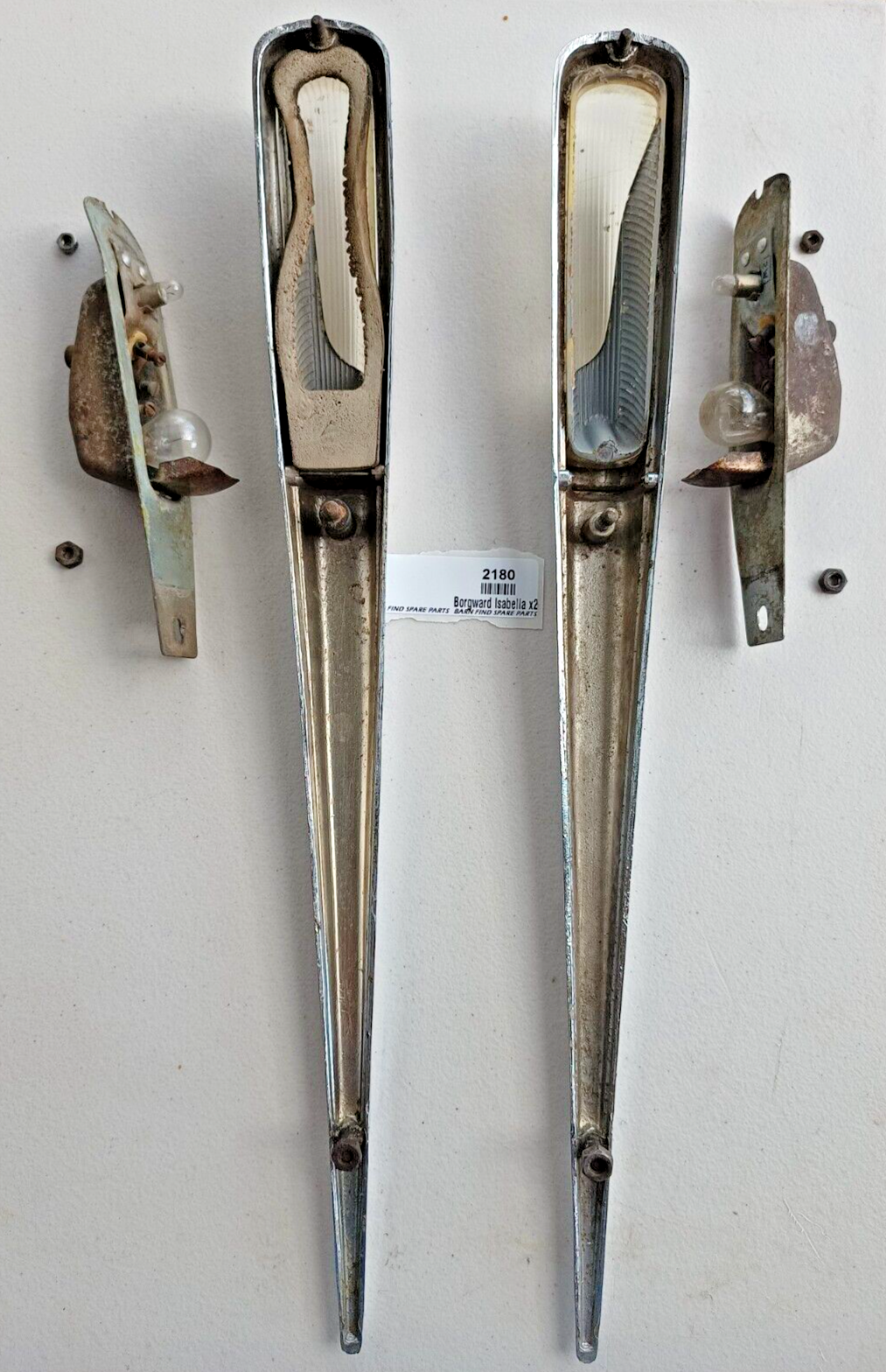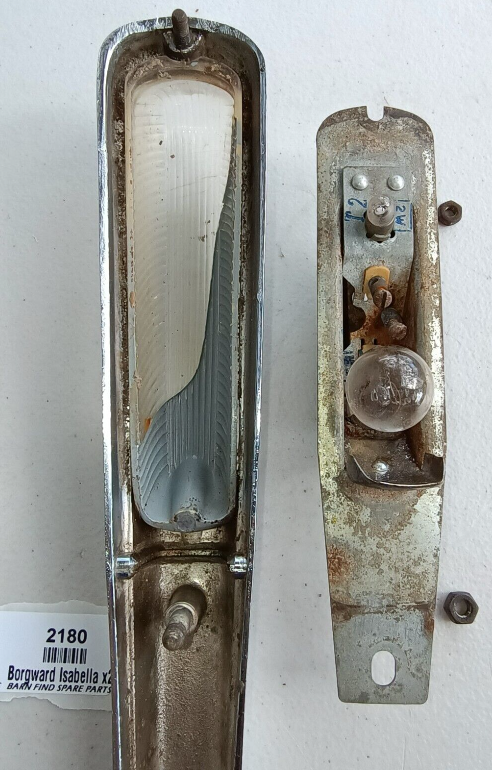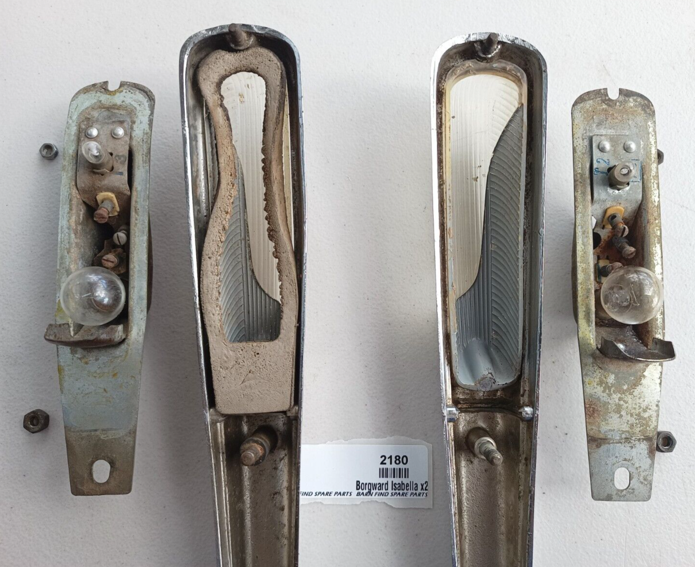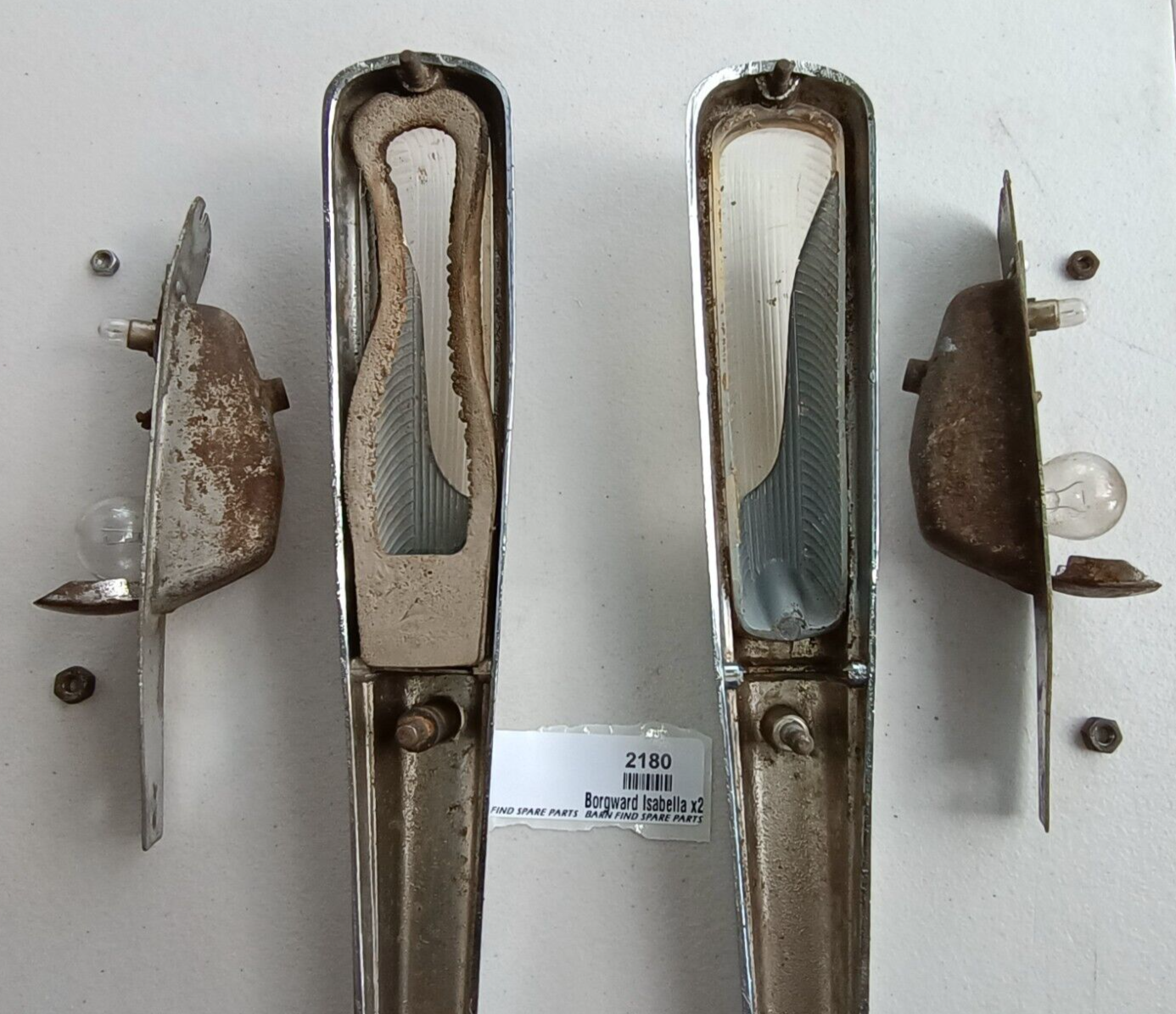Original Borgward Isabella USED pair of left and right front Indicator housings with lenses as fitted to the top of front guards on both the coupe and saloon. They both show some pitting to the chrome. They came from a mid 60's Borgward dealer and service centre.  Used condition, bulbs tested and working - please see photos as they form part of the description.