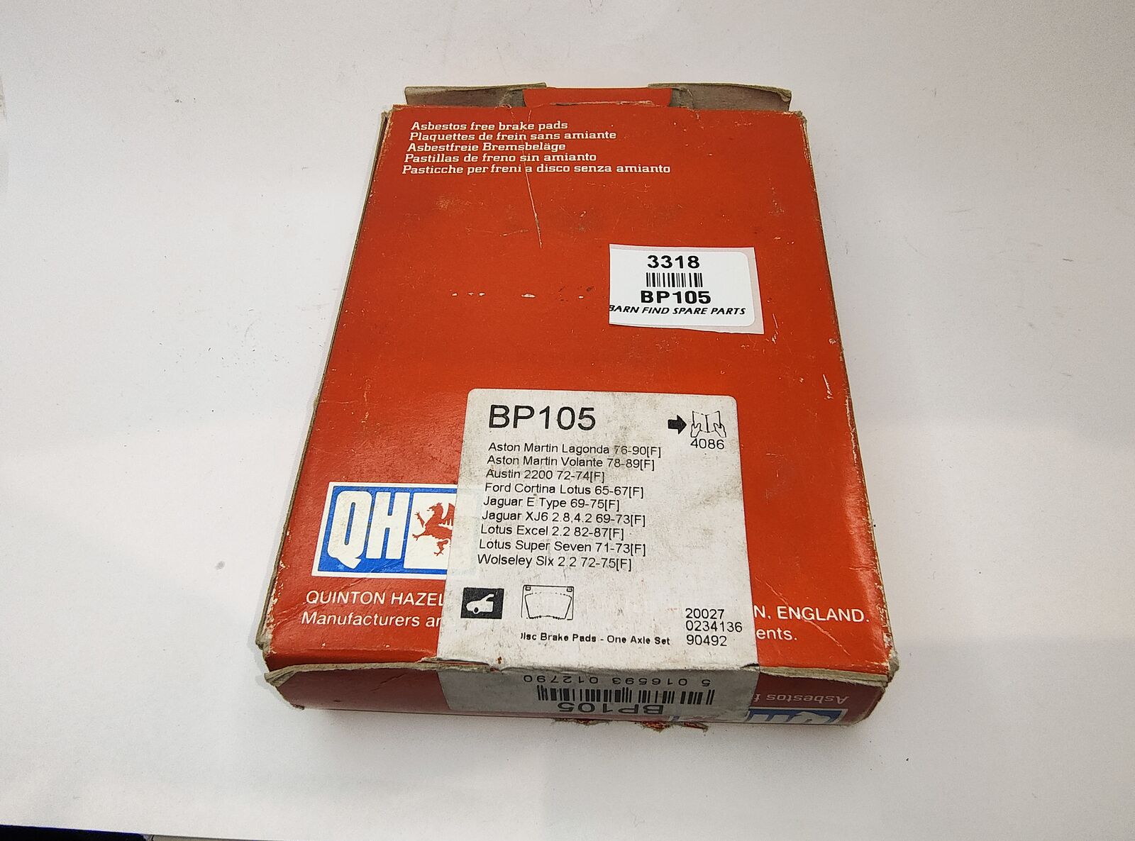 QH (Quinton Hazell) Front Brake Pads  New Old Stock in original box BP105, To Suit Aston Martin Lagonda 76-90, Aston Martin Volante 78-89, Austin 2200 72-74, Ford Cortina 65-67, Jaguar E Type 69-75, Jaguar XJ6 2.8 & 4.2 69-73, Lotus Excel 2.2 71-73, Lotus Super Seven 71-73, Wolseley Six 2.2 72-75. Pads Measure 98mm x 66mm x 15.5mm. Please see photo(s) - they form part of the description.