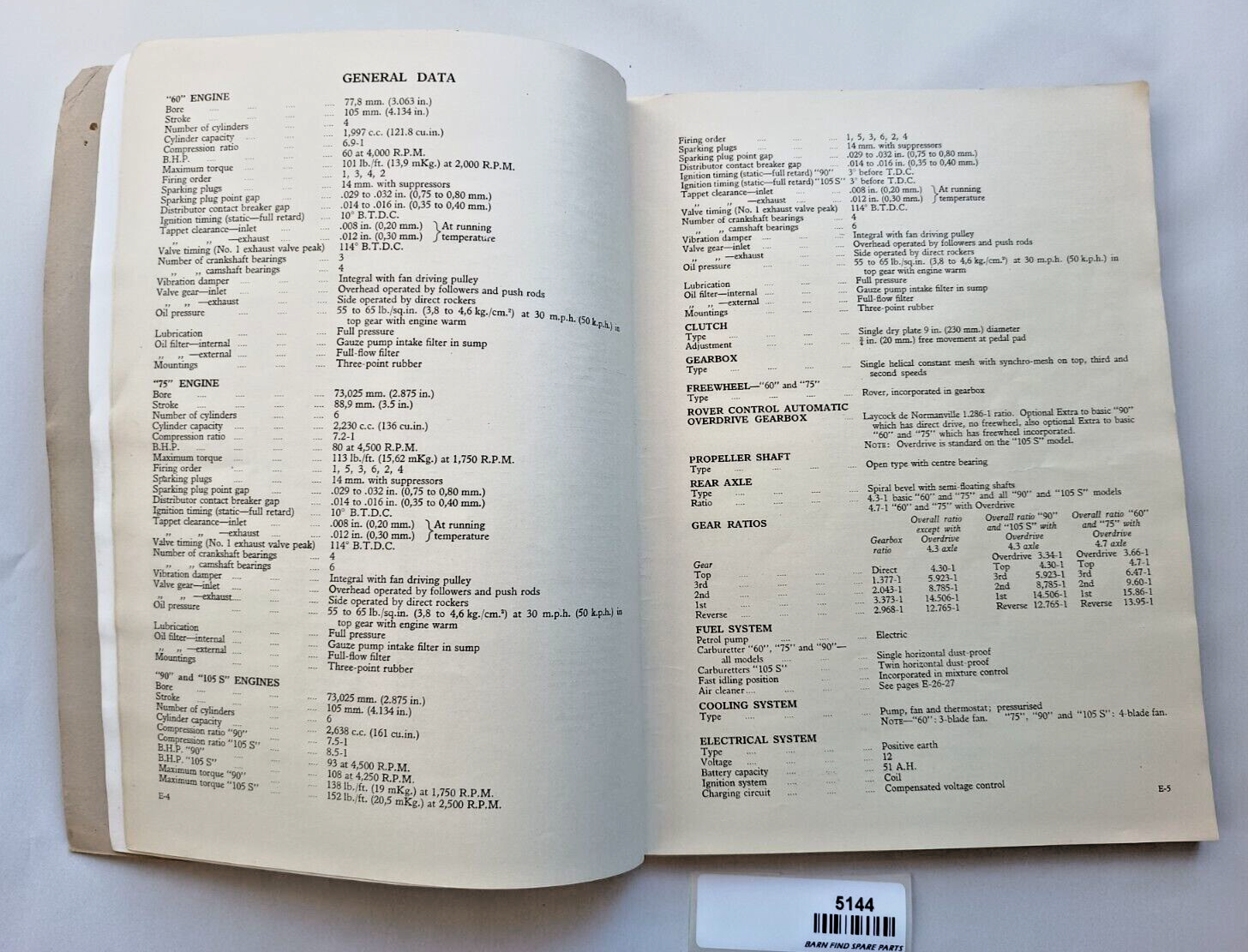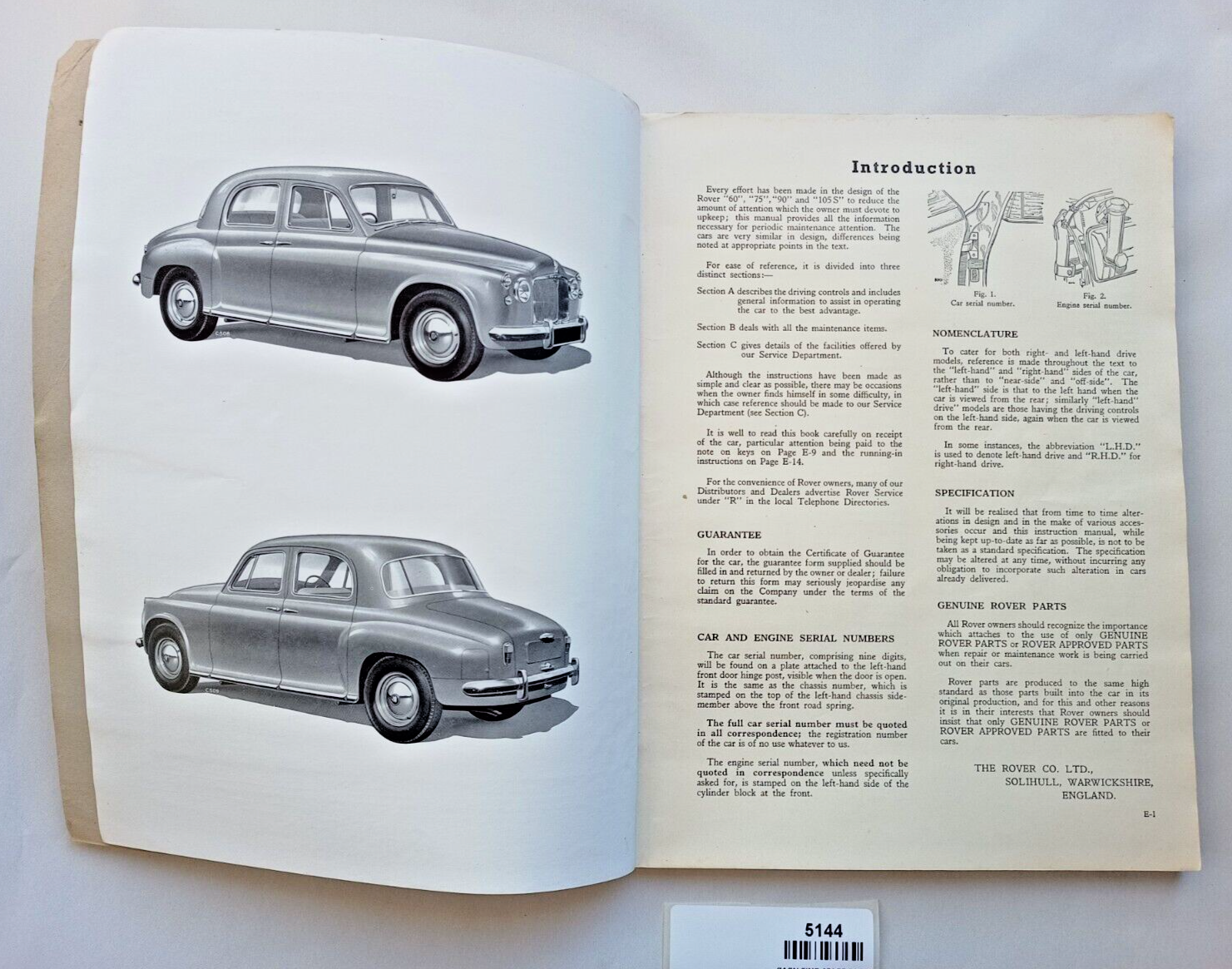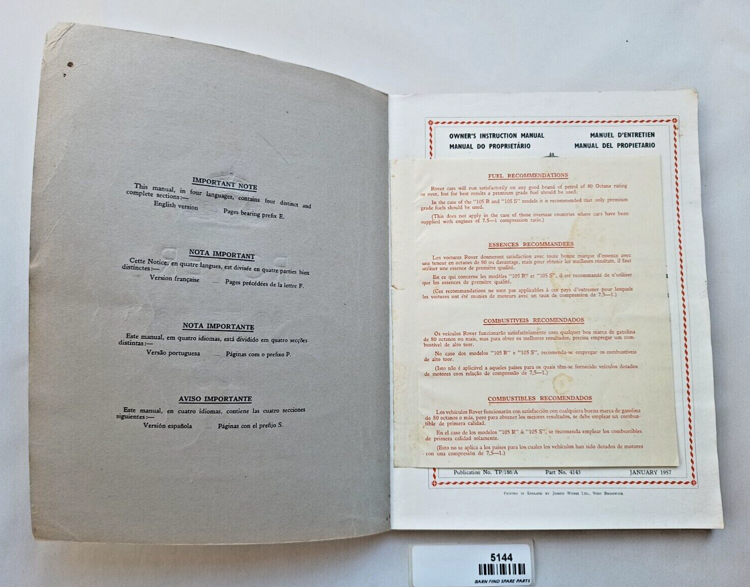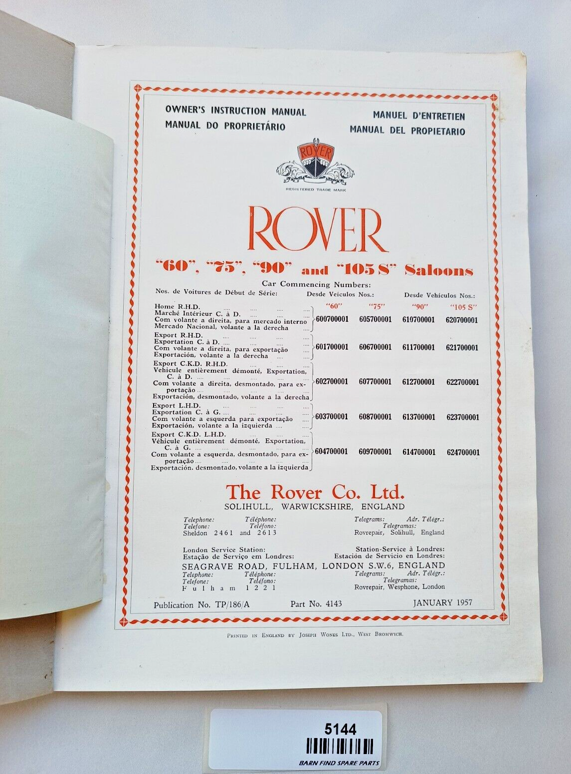 An original Rover P4 60 75 90 105 Saloon 1957-58 Owners Instruction & Maintenance Manual. January 1957 edition part number 4143.   The manual is in four languages - English, French, Portuguese and Spanish. The cover is thin cardboard. Please see photo(s) - they form part of the description.