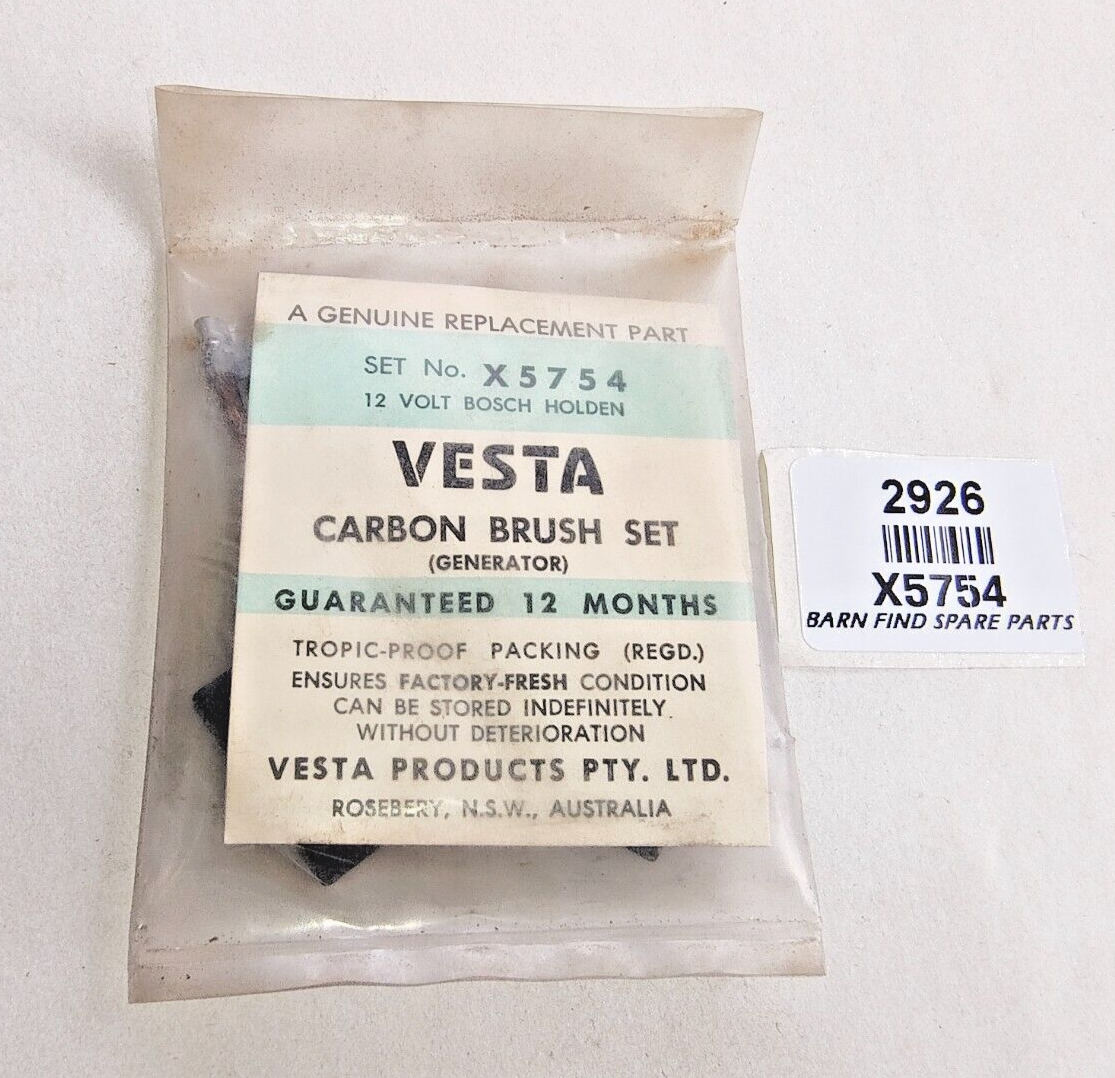 Vesta Original Brush Set X5754 New Old Stock in original packet. Holden Part number 7406554, To Suit Bosch Generator as fitted to Holden FB - EK, Volkswagen (1.6L around 1967 to 1973). Brush measures 21.45MM Wide x 25 MM x 5.90 MM Thick and with a 45MM lead. Please see photo(s) - they form part of the description.